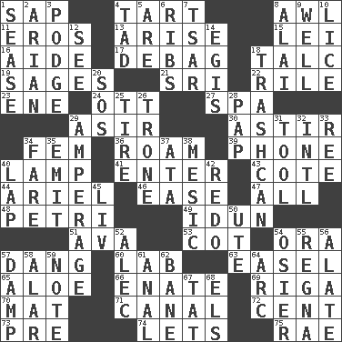 ACROSS 1. Plant excrement 4. Small pie 8. Leather borer 11. Greek god of love 13. Get up 15. Luau accessory 16. Helper 17. Debunk (Brit. slang) 18. Baby powder 19. Gurus 21. _ Lanka 22. Cause heat under the collar 23. Compass dir. 24. Baseball player Mel 27. Health resort 29. SW Saudi Arabia district 30. Being in motion 34. Opposite of masc. 36. Wander aimlessly 39. Give a jingle 40. Desk light 41. Keyboard key 43. ____ d'Azur (French Riviera) 44. Satellite of Uranus 46. Relaxation 47. Everything 48. _ dish (used to culture cells) 49. Goddess of spring and wife of Bragi 51. Actress Gardner 53. Small bed 54. Mouth or opening 57. Mild oath, euphamism for damn 60. Experiment locale 63. Artist's stand 65. Medicinal plant 66. Related on the mother's side 69. Port city in Latvia 70. Floor protector 71. Lessep's creation 72. Penny 73. Before (prefix) 74. Allows 75. Actress Charlotte DOWN 1. Gospel singer Marvin 2. Believer in; advocate of (suffix) 3. Porridge 4. Bit 5. "We ___ not amused" (Victoria) 6. Chest bones 7. Russian ruler of old 8. Jai _ 9. Water source 10. Louse (plural) 12. Observe 14. The front part of a cuirass 18. File 13 20. Mayday 25. Become fatigued 26. Marketplace scale 28. Infant food 29. Electrical Measurement 31. Implement 32. International (abbr.) 33. To riddle 34. Conductor's collection 35. Send forth 37. "One Day ___ Time" 38. Mesonic 40. Pet locale 42. Make new 45. 54 in ancient Rome 50. Shoshoni 52. Actor Baldwin 54. Flexible twig of a willow tree 55. Rain (Swedish) 56. Having winglike extensions 57. Moist 58. Having or resembling wings 59. Make mention of 61. Of or related to the anus 62. Object of repulsion 64. Curve 67. Make lace 68. Raised railways