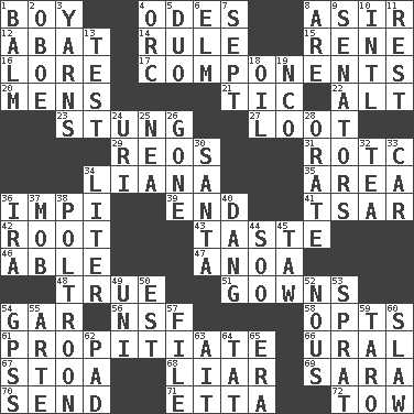 ACROSS 1. Male child 4. Lyric poems 8. SW Saudi Arabia district 12. Blind as ____ 14. Court order 15. French philosopher Descartes 16. Old wives' tales, e.g. 17. Pieces 20. Not women's 21. Nervous spasm 22. The first octave above the treble staff 23. Feeling sharp psychological pain 27. Plunder 29. Vintage cars 31. College mil. group 34. Woody, climbing, usually tropical plant 35. Length times width 36. Body of Kaffir warriors 39. Conclusion 41. Russian ruler of old 42. Carrot, for example 43. Clothes sense 46. Competent 47. Small Philippine buffalo 48. Loyal 51. Brides' dresses 54. Slender fish 56. Overdraft (abbr.) 58. Elects 61. Conciliate 66. Mountain range 67. Portico 68. One who doesn't tell the truth 69. "Two Mules for Sister ____" 70. Post 71. Singer James 72. Pull behind DOWN 1. Lip ointment 2. Mitch Miller's instrument 3. Tall tales 4. The grampus (Milton) 5. Superhero pair 6. Shade tree 7. Back-to-school mo. 8. "We ___ not amused" (Victoria) 9. Legislators 10. International (abbr.) 11. Relief 13. Trial 18. Petroleum 19. Non-commissioned officer (abbr.) 24. RI univ. 25. Teachers' org. 26. Went 28. Speak pompously 30. Before Barbara or Clara 32. Afternoon social gathering 33. 4-wheeled motor vehicle 34. 61 cubic inches 36. Lyricist Gershwin 37. Crowd into 38. Coward 40. Mild oath, euphamism for damn 44. "Barney Miller" actor Jack 45. The 23rd letter of the Hebrew alphabet 49. Corn or form start 50. Eastern Standard Time (abbr.) 52. Common sense 53. Small fatty European fish 54. Global Positioning Systems (abbr.) 55. Johnson of "Laugh-In" 57. Do some clerical work 59. Pacific island yam 60. Cole _ (cabbage dish) 62. Writing tablet 63. Small island 64. Make lace 65. Period