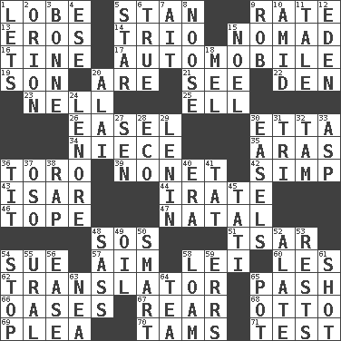 ACROSS 1. Ear part 5. Comedian Laurel of Laurel & Hardy 9. Pace 13. Greek god of love 14. Musical group of three 15. Wanderer 16. Prong on a fork 17. Car 19. Boy, to dad 20. "We ___ not amused" (Victoria) 21. Perceive with the eye 22. Lair 23. 1994 drama film starring Jodie Foster 25. Pipe bend 26. Artist's stand 30. Singer James 34. Sibling's daughter 35. Caspian sea tributary 36. "Corrida" creature 39. Music written for nine 42. Simple or foolish person 43. Austrian river, tributary to the Danube 44. Feeling or showing extreme anger 46. Drink excessively 47. Relating to or accompanying birth 48. Distress signal 51. Russian ruler of old 54. Take to court 57. Direct toward a target or goal 58. Flowery wreath 60. French article 62. Interpreter 65. Romantic infatuation 66. Fertile tracts in a desert 67. Bring up, as a child 68. "Beetle Bailey" pooch 69. Entreaty 70. Scottish caps 71. Trial DOWN 1. Allows 2. Constellation of myth 3. Maid-servant 4. Compass dir. 5. Play the lead 6. Loyal 7. Small island 8. Trap for birds or small mammals 9. Director Reiner 10. Among 11. Lie 12. Genesis locale 15. Christmas carol 18. Cartoonist voice _ Blanc 20. Mountain range southwest of Kyrgyzstan 24. Poe poem 27. Elected rep. 28. Environmental prefix 29. Soviet premier 1918-24 30. Artist's stands 31. Three (prefix) 32. Scottish cap 33. Viper 36. Teat (slang) 37. Bear (Spanish) 38. Strike 40. Epoch 41. Make lace 45. Jacques of French films 48. Backtalk 49. Lubricate 50. Don Adams' spy role 52. Having winglike extensions 53. Musical pauses 54. Halt 55. Mountain range 56. Relaxation 58. Rich soil 59. Blunders 61. Opportunity 63. Teachers' org. 64. Afternoon social gathering 65. Cooking vessel