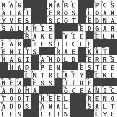 ACROSS 1. Tired old horse 4. Female horse 8. Personal Computers (abbr.) 11. Mountain range southwest of Kyrgyzstan 13. Greek god of love 14. Rich soil 15. Jacques Cousteau's middle name 16. Highlander 17. Pulitzer Prize-winning author Ferber 18. Deli grouping 21. _ Allan Poe 22. Libertine 23. Compete 25. Shade tree 26. Distant 29. One of the two male reproductive glands 32. Sends forth 34. Actress Charlotte 35. Krazy ___ of comics 38. Wise men 39. Hold, grip (Informal) 41. Blunders 43. Possessed 44. Animal enclosure 45. First name in cosmetics 46. Plea 50. Supplement with great effort 51. ___ Haven, CT 54. Curvy letter 55. Hoop that covers a wheel 57. Scent 59. Pertaining to the sea 63. A blast of a horn 64. The bottom of a shoe or boot 67. Former U.S. Attorney General Janet 68. Sums up 69. Of or related to the anus 70. Table seasoning 71. French article 72. Allows 73. Sodium hydroxide DOWN 1. Negative votes 2. Inventor's middle name 3. Highlander 4. Makes clutter 5. Curve 6. Friend of Pooh 7. Eastern Standard Time (abbr.) 8. Porridge 9. Lessep's creation 10. Excessive but superficial compliments 12. Austrian river, tributary to the Danube 14. Directed 19. Floor coverings 20. Mamie's mate 21. Snakelike fish 23. Small bottle 24. On the rocks 26. Opposite of masc. 27. Wet nurse 28. Capital of Latvia 30. Marketplace scale 31. Supplements with great effort 33. Event that recurs at intervals 36. Johnson of "Laugh-In" 37. Long journey 39. Flats, for short 40. Possessive pronoun 42. Perceive with the eye 45. Jane of fiction 47. Teachers' org. 48. Ringlike coral islands and reefs 49. Nervous spasm 51. Relating to or accompanying birth 52. Eat (away) 53. Forest 56. Hearing organs 58. Mountains (abbr.) 60. Anneal 61. In an inward manner 62. ____ d'Azur (French Riviera) 64. Actor Linden 65. Compass dir. 66. Ingest