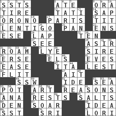ACROSS 1. Fast planes 5. Had dinner 8. Mouth or opening 11. Become fatigued 12. Jacques of French films 14. Plant excrement 15. U. of Maine site 17. Actors' quests 18. Teat (slang) 19. Small, flat, pigmented spot on the skin 21. Baking dish 22. Followers of ems 23. Compass dir. 24. Infant locale 25. Nine, plus one 27. Observe 28. SW Saudi Arabia district 31. Wander 35. Sodium hydroxide 37. Title for a man of rank and authority 38. Celtic language 39. Raised railways 41. Nights before holidays 42. Comfort 43. Call ___ day 45. For fear that 46. Sudden quick movement 47. Small island 49. Compass dir. 51. Binary compound 52. Ocean 55. Plant holder 57. Tate display 60. Thinks logically 62. Santa ___, CA 63. Musical pauses 65. Table seasonings 66. Lair 67. Fly high 68. It may be bright or harebrained 69. Fast jet (abbr.) 70. _ Lanka 71. Australian parrot (variant) DOWN 1. Fur scarf 2. Titles for men of rank and authority 3. Heavy duty weighing machine 4. Transmitted 5. "One Day ___ Time" 6. Canvas cover 7. Singer James 8. Clearly or manifestly demonstrative 9. Precipitation 10. Tenement units (abbr.) 13. Is not 16. Petroleums 17. Wimpy's pal 20. Highlander 26. Artist's stand 29. Angers 30. State of inaction 31. Coral collection 32. Relating to the mouth 33. Aide 34. Confronts 36. Connecticut Ivy Leaguer 40. Flight of steps 44. Assistant 48. Afternoon social gatherings 50. Armed conflicts 52. Twentieth part of a lira 53. Keyboard key 54. Slender Brazilian palm 55. Writing tablets 56. Singles 58. Vintage cars 59. Russian ruler of old 61. Travel by water 64. Three (prefix)