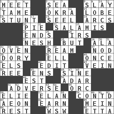 ACROSS 1. Confront 5. Ocean 8. Kill 12. Docile 13. Gumbo ingredient 15. Ear part 16. Check the growth or development of 18. Sew up the eyelids of hawks and falcons 19. Curves 20. Sliced dessert 22. Deli grouping 24. Conclusions 26. Big collection agency 27. Delicate 28. On the contrary 29. According to 32. Baking chamber 35. 480, 500 or 516 sheets of paper 37. Lower and raise head in agreement 38. Rowboat 39. Pipe bend 40. At one time in the past 41. Raised railways 42. Prepare for publication 43. Distinctive style or manner 44. To separate or throw off 45. Followers of ems 46. Trig term 49. Eastern Standard Time (abbr.) 50. The sixth month of the Jewish calendar 51. Contrary to your interests or welfare 55. The grampus (Milton) 56. Writer Wiesel 57. Liveliness 59. Continued (abbr.) 63. Age 64. Merit 65. Count _ (2 wds.) 66. Respite 67. Compass dir. 68. Singer James DOWN 1. Mountains (abbr.) 2. Erode 3. Australian flightless bird 4. 3-inch nail 5. Mayday 6. Makes supply last 7. Length times width 8. Shuts with force 9. Australian parrot (variant) 10. Lettered men learn these first 11. It is so 14. Plant genus of onion and garlic 17. Prong on a fork 21. Begley and Asner 23. Nonscientific branch of learning 25. Tears up 28. Greek mezzo-soprano Agnes 29. Singer Murray 30. Event scenes 31. An important port of Yemen 32. Baltic tributary 33. Short-tailed, large-bodied rat 34. Celtic language 36. Connecticut Ivy Leaguer 40. Conquer 42. Main course 45. Compass dir. 47. Wedding promise 48. Drug cop 49. Incident 51. Toward shelter 52. "Vaya con ____" 53. Cole _ (cabbage dish) 54. Hearing organs 56. Hearing organ 58. Compass dir. 60. Fish or hair follower 61. Teat (slang) 62. Heredity factor (abbr.)