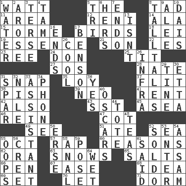 ACROSS 1. Electrical Unit 5. Definite Article 8. Small amount or degree 11. Length times width 12. Painter Guido (1575-1642) 14. Wing 15. Singer Mel 17. Avian creatures 18. Luau accessory 19. Center 21. Manchild 22. French article 23. To riddle 24. Spanish title 25. Teat (slang) 27. Distress signal 28. Nathan's nickname 31. Fastener 35. Myrna of the movies 37. Sudden quick movement 38. Expression of disdain 39. Modern: prefix 41. Monthly bill 42. In addition 43. Fast jet (abbr.) 45. At sea 46. It's straight from the horse's mouth 47. Small bed 49. Perceive with the eye 51. Had dinner 52. Ocean 55. Sep. follower 57. Strike 60. Thinks logically 62. Mouth or opening 63. Overwhelms 65. Table seasonings 66. Fenced enclosure 67. Relaxation 68. The content of cognition 69. Put into a specified state 70. Allow 71. Dormintory (informal) DOWN 1. Wetness 2. Came up 3. Laconic 4. Docile 5. Three (prefix) 6. Possessive pronoun 7. Inside; within (prefix) 8. Baron Munchausen's specialties 9. Toward shelter 10. Raised platform 13. Is not 16. Conclusions 17. Gillaume's butler role 20. Calm and collected 26. Kind of red light 29. Prong on a fork 30. Singer James 31. Coast Guard woman 32. The longest river in the world 33. Helper 34. Give a jingle 36. It is so 40. Motion picture awards 44. Lug 48. Afternoon social gatherings 50. Celtic language 52. Twentieth part of a lira 53. Keyboard key 54. Indian state 55. I made a mistake 56. Algonquian 58. Of or related to the anus 59. Introduce or present, as a question 61. Alleged 64. Dripping