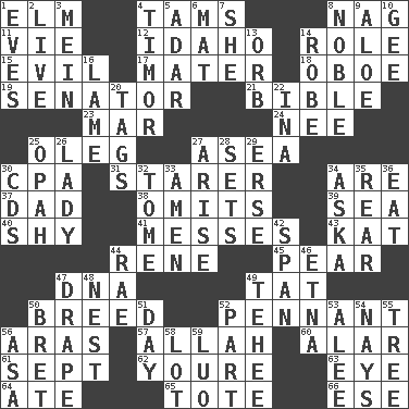 ACROSS 1. Shade tree 4. Scottish caps 8. Tired old horse 11. Compete 12. Potato state 14. Hero or heavy, e.g. 15. Morally bad or wrong 17. Mother 18. Mitch Miller's instrument 19. Legislator 21. Instruction Manual for Humans 23. Third mo. 24. Born 25. Cassini of fashion 27. At sea 30. Numbers guy (abbr.) 31. A viewer who gazes fixedly 34. "We ___ not amused" (Victoria) 37. Male parent 38. Leaves out 39. Ocean 40. Like a shrinking violet 41. Makes clutter 43. Krazy ___ of comics 44. French philosopher Descartes 45. Lightbulb-shaped fruit 47. Heredity factor (abbr.) 49. Make lace 50. A special lineage 52. Pre-World Series prize 56. Ancient river in northeast Turkey 57. Assad's deity 60. Having or resembling wings 61. Back-to-school mo. 62. You are 63. Sight organ 64. Had dinner 65. Carry 66. Compass dir. DOWN 1. Nights before holidays 2. Not recorded 3. Count _ (2 wds.) 4. The easternmost of the Lesser Sundas 5. The sixth month of the Jewish calendar 6. Floor covering 7. A female animal or person 8. Having high moral qualities 9. _ vera 10. Turn to the right 13. Globe 14. Loose flowing garment 16. Unable to walk 20. Labels 22. _ tizzy (2 wds.) 25. Brightly colored fish 26. Kenny Rogers chart-topper in '80 27. Ascend 28. Arranges properly for use 29. Celtic language 30. Music discs 32. Heavy book 33. So be it 34. "____ silly question..." 35. Rump 36. Consume 42. Connect, as a bridge 44. Actress Charlotte 46. Inactive volcano in Sicily 47. Window treatment 48. Egg locale 49. Giggle 50. Cy Young winner Saberhagen 51. 24 hours 52. Component 53. Toward shelter 54. Negative votes 55. Relationship diagram 56. White ___ sheet 58. Car dealer's back yard 59. Nilotic language