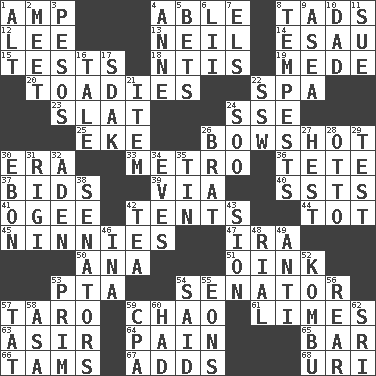 ACROSS 1. Electrical Unit 4. Competent 8. Small boys 12. Area sheltered from the wind 13. Famous astronaut Armstrong 14. He sold his birthright 15. Trials 18. Nuclear Threat Initiatives 19. Ancient Persian 20. Sycophants 22. Health resort 23. Narrow board 24. Compass dir. 25. Make supply last 26. The distance a bow sends an arrow 30. Period 33. Paris' subway 36. Wig 37. Auction offers 39. By way of 40. Fast planes 41. Double curve, resembling the letter S 42. Portable shelters 44. Small child 45. Simpletons 47. Retirement account (abbr.) 50. Santa ___, CA 51. Pig sound 53. Parent Teacher Association (abbr.) 54. Elected representative 57. Edible starchy tuberous root 59. US Secretary of Labor Elaine L. _ 61. Citrus fruits 63. SW Saudi Arabia district 64. Ache 65. Oblong piece of solid material 66. Scottish caps 67. Sums up 68. RI univ. DOWN 1. The first octave above the treble staff 2. Rendezvous 3. Mexican monetary units 4. Queen of England 1702-14 5. Wagers 6. Cards in a Roman deck? 7. Raised railways 8. Storms 9. At sea 10. June honoree 11. Institute legal proceedings 16. Story 17. Neighbor of Neb. 21. Detail 22. Compass dir. 24. "Barney Miller" actor Jack 26. Naughty child 27. Command 28. "Beetle Bailey" pooch 29. Trial 30. Inky black, to poets 31. Swiss mountan, "Queen of the Mountains" 32. An important port of Yemen 34. Nights before holidays 35. Shallow baking pan 38. Legislators 42. Afternoon social gathering 43. The Jewish people; Israel 46. _ tizzy (2 wds.) 48. Monetary unit of Yemen 49. Against 52. Dried seaweed eaten as food 53. Demure 54. Stated 55. Immeasurably long periods of time 56. Rump 57. Make lace 58. White ___ sheet 59. Numbers guy (abbr.) 60. Possessed 62. _ Lanka