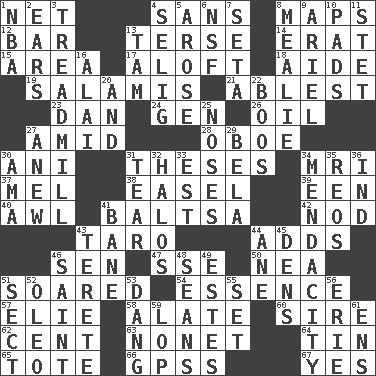 ACROSS 1. Remaining after all deductions 4. Without 8. Atlas contents 12. Oblong piece of solid material 13. Laconic 14. Part of Q.E.F. 15. Type of rug 17. At or to great height 18. Assistant 19. Deli grouping 21. Most capable 23. One of the 12 tribes of Israel 24. Commissioned mil. rank 26. Petroleum 27. Among 28. Mitch Miller's instrument 30. Black tropical American cuckoo 31. College papers 34. Medical imaging device (abbr.) 37. Cartoonist voice _ Blanc 38. Artist's stand 39. Car or cant ending 40. Leather borer 41. Greek mezzo-soprano Agnes 42. Allow head to fall sleepily 43. Pacific island yam 44. Sums up 46. Elected rep. 47. Compass dir. 50. Teachers' org. 51. Flew 54. Core 57. Writer Wiesel 58. Having winglike extensions 60. Father 62. Penny 63. Music written for nine 64. Metal container 65. Carry 66. Global Positioning Systems (abbr.) 67. Consenting reply DOWN 1. Basketball assoc. 2. Hearing organs 3. Excercise machine 4. Former Milwaukee Brewers owner Bud 5. Came up 6. Overdraft (abbr.) 7. Stalk of a moss capsule 8. Ear of corn 9. Satellite of Uranus 10. Groovy apts. 11. Proofreading order 13. Scottish cap 16. Jai ____ 20. Also 22. Scornful sounds 25. Olfactory organs 27. Afresh 29. Actor Lugosi 30. Nursemaid (var.) 31. Pull apart 32. Auras 33. Eastern Standard Time (abbr.) 34. Ananias' fault 35. Vintage cars 36. Indiana (abbr.) 41. Object of repulsion 43. Cylindrical with tapered ends 44. A saturated hydrocarbon 45. Lairs 46. Inhabitant of Heaven 48. Actors Connery and Penn 49. _____ Park, CO 51. Religious group 52. Butter sub 53. Mild oath, euphamism for damn 55. Put into a specified state 56. 4th largest of the Great Lakes 59. Trim (branches) 61. Followers of ems