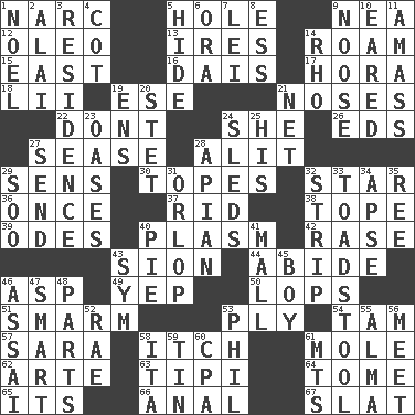 ACROSS 1. Drug cop 5. Hollow 9. Teachers' org. 12. Butter sub 13. Angers 14. Wander aimlessly 15. 90 degrees 16. Raised platform 17. Israeli folk dance 18. Cards in a Roman deck? 19. Compass dir. 21. Olfactory organs 22. Do not 24. A female animal or person 26. Begley and Asner 27. Gospel singer Marvin 28. Set down 29. Elected reps. 30. Drinks excessively 32. Play the lead 36. Single time 37. To free from 38. Drink excessively 39. Lyric poems 40. Suffix with ecto or cyto 42. To erase 43. The Jewish people; Israel 44. Stay 46. Cleo's killer 49. Slangy assent 50. Chops off 51. Excessive but superficial compliments 53. Strand of rope, yarn or thread 54. Scottish cap 57. "Two Mules for Sister ____" 58. Hankering 61. Undercover agent 62. Johnson of "Laugh-In" 63. Native american tent (variation) 64. Heavy book 65. It is 66. Of or related to the anus 67. Narrow board DOWN 1. Christmas carol 2. Mountain range southwest of Kyrgyzstan 3. Home 4. Small bed 5. Flintstone garb 6. Mouth or opening 7. Flowery wreath 8. Curvy letter 9. Trap for birds or small mammals 10. Having ears or earlike features 11. Collect or gather 14. 17th letter of the Greek alphabet 19. Followers of ems 20. Proofreading order 21. Fish or hair follower 23. Fertile tracts in a desert 24. Bobsleighs 25. Part of HMS, perhaps 27. Transmit 28. Bee-related 29. "Barney Miller" actor Jack 31. Fourth or lowest deck 32. Remove all contents or possession from 33. Inedible or poisonous agaric 34. Domed church section 35. To separate or throw off 40. Sliced dessert 41. Shopping center 43. Symbol (abbr.) 45. Male child 46. Slender Brazilian palm 47. Don Adams' spy role 48. Components 52. Actress Charlotte 53. Silvers or Donahue 55. _ mater 56. Rendezvous 58. Call ___ day 59. Metal container 60. Numbers guy (abbr.) 61. Mountains (abbr.)