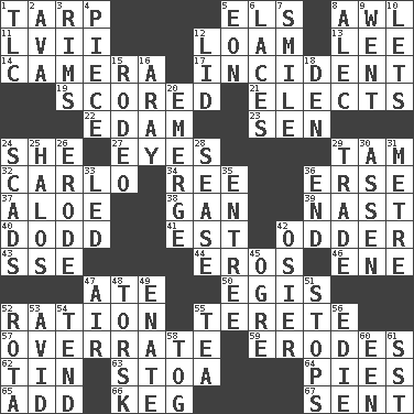ACROSS 1. Canvas cover 5. Raised railways 8. Leather borer 11. 57 in ancient Rome 12. Rich soil 13. Area sheltered from the wind 14. Device for capturing images 17. Event 19. Tallied 21. Chooses 22. Dutch treat 23. Elected rep. 24. A female animal or person 27. Snake ____ (dice throw) 29. Scottish cap 32. Monte _, Las Vegas Hotel/Casino 34. Portuguese money of account (variant) 36. Celtic language 37. _ vera 38. Separate the seeds from cotton 39. Political cartoonist Thomas 40. Texas town _ City 41. Eastern Standard Time (abbr.) 42. More peculiar 43. Compass dir. 44. Greek god of love 46. Compass dir. 47. Had dinner 50. Armor plate that protects the chest 52. Food allowance for one day 55. Cigar-shaped 57. Make much ado about nothing 59. Eats (away) 62. Metal container 63. Portico 64. Sliced desserts 65. Find the sum of 66. Cask 67. Emitted DOWN 1. Affectionate concern, for short 2. Actress Gardner 3. Basketball hoops 4. Part 5. Period of immesurable duration 6. Shoestrings 7. Grin 8. Actor Baldwin 9. Left 10. Allows 12. Hat (slang) 15. Cowboy competition 16. Like ___ of sunshine 18. Lair 20. Develop 24. Heaps 25. Rings 26. Wear away 28. Gospel singer Marvin 29. Exchange 30. NE Netherlands city 31. Distance measurement (Brit.) 33. Directed 35. Main course 36. Conclude 42. Flexible twig of a willow tree 45. Legendary monster 47. Atmosphere 48. Cod relative 49. Related on the mother's side 51. Constricts 52. Round or rotation of duties 53. Enthusiastic 54. Be inclined (to) 55. Beverage made from leaves 56. Singer Brickell 58. Coat; cloak 60. Car or cant ending 61. Fast jet (abbr.)