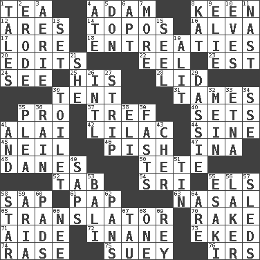 ACROSS 1. Afternoon social gathering 4. First man 8. Peachy ____! 12. Ancient Greek god of war 14. Literary convention 16. Inventor's middle name 17. Old wives' tales, e.g. 18. Pleas 20. Proofreads 22. Snakelike fish 23. Eastern Standard Time (abbr.) 24. Observe 25. Part of HMS, perhaps 28. Flaplike covering 30. Portable shelter 31. Makes less strong or intense 35. Adept person 37. Not kosher 40. Arranges properly for use 41. Jai _ 42. Pale purple color 44. Trig term 45. Famous astronaut Armstrong 46. Expression of disdain 47. _ tizzy (2 wds.) 48. Natives or inhabitants of Denmark 50. False hair 52. Bar bill 54. _ Lanka 55. Raised railways 58. Plant excrement 61. Infant food 63. Rhinal 65. Interpreter 70. Libertine 71. Assistant 72. Lacking in sense or substance 73. Supplemented with great effort 74. Raze (variant) 75. Chop _ 76. Big collection agency DOWN 1. Stories 2. Wear away 3. Nest on high 4. Had dinner 5. Spanish title 6. Fitting 7. Greater amount 8. Krazy ___ of comics 9. Writer Wiesel 10. Nights before holidays 11. Political cartoonist Thomas 13. Put into a specified state 15. Sew up the eyelids of hawks and falcons 19. Set down 21. A female animal or person 26. International (abbr.) 27. Empty completely 29. Small ungulate mammals of Africa 30. Bathroom plumbing fixture 32. Chow _ 33. Inactive volcano in Sicily 34. Compass dir. 35. Entreaty 36. Precipitation 38. Biblical high priest 39. Goes without food and/or water 41. Added to 43. "Mermaids" star 49. Plant excrements 51. Metal container 53. Indonesian resort city 55. 1973 Nobel Price Winner (Physics) Leo 56. Member of a famous L.A. basketball team 57. Bobsleighs 58. Play the lead 59. Operatic vocal solo 60. Writing tablets 62. Baking dishes 64. "We ___ not amused" (Victoria) 66. Born 67. The 19th letter of the Greek alphabet 68. Single 69. Marina Del _, California