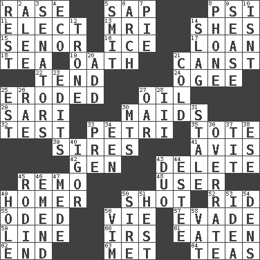 ACROSS 1. To erase 5. Plant excrement 8. 23rd letter of the Greek alphabet 11. Voters do this 13. Medical imaging device (abbr.) 14. "______ My Girl" (Turtles hit) 15. Sir (Sp.) 16. Frozen water 17. Grant temporary use of 18. Beverage made from leaves 19. Pledge 21. 2nd pers. sing. pres. of can (arch.) 22. Watch over 24. Double curve, resembling the letter S 25. Worn away 27. Lubricate 29. Indian skirt 30. Unmarried girls 32. Trial 33. _ dish (used to culture cells) 35. Carry 39. Founders of families 41. Advice 42. Commissioned mil. rank 43. Erase 45. San ____ (Riviera town) 48. One who makes use of a thing 49. Baseball hit which scores a run 50. Opportunity 52. To free from 55. Wrote a lyric poem 56. Compete 57. Elude 59. Actor's bit 60. Big collection agency 61. Consumed 62. Conclude 63. Was introduced to 64. Afternoon social gatherings DOWN 1. Take ten 2. Toward shelter 3. Legislators 4. Environmental prefix 5. Stricken, poetically 6. Bowlike part 7. Sliced dessert 8. Give a jingle 9. Gospel singer Marvin 10. Is not 12. Marketplace scale 14. Volcanic refuse 20. Find the sum of 21. Having a low temperature 23. Proofreads 25. Eastern Standard Time (abbr.) 26. Actress Charlotte 27. Rowing implement 28. One more than two 30. Mountains (abbr.) 31. Having lost freshness 33. Before (prefix) 34. Car or cant ending 36. Make much ado about nothing 37. Teat (slang) 38. Compass dir. 40. Russian composer Stravinsky 43. Superhero pair 44. First name in cosmetics 45. "The Thinker" sculptor 46. Make improvements or corrections to 47. Ancient Persian 49. Opening into or through something 50. Title for a man of rank and authority 51. Command 53. It may be bright or harebrained 54. Lairs 56. Zeal 58. Large container