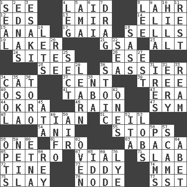 ACROSS 1. Observe 4. Put down 8. Cowardly lion portrayer 12. Begley and Asner 13. Arab leader 14. Writer Wiesel 15. Of or related to the anus 17. Greek goddess of the earth (variant) 18. Makes a sale 19. Member of a famous L.A. basketball team 21. Girls' org. (abbr.) 23. Keyboard modifier key 24. Locates 26. Compass dir. 28. Stitch closed the eyes of (a falcon) 30. More disrespectful 34. Domesticated feline 37. Penny 39. Woody plant 40. Bear (Spanish) 41. Off limits 43. Period 44. Gumbo ingredient 46. Water falling in drops from the sky 47. Symbol (abbr.) 48. Of or relating to Laos or its people 51. To provide with a ceiling 54. Black tropical American cuckoo 55. Discontinues 58. Single 61. Back 63. Phillipine bananalike plant 65. Stone: prefix 67. Small bottle 71. Thick slice 72. Prong on a fork 73. Whirlpool 74. Madame (abbr.) 75. Kill 76. Connecting point 77. Fast jet (abbr.) DOWN 1. Lick closed 2. Ferber et al. 3. 1973 Nobel Price Winner (Physics) Leo 4. Part of a journey 5. Housemaid (var.) 6. One more than two 7. To be drawn or hauled along 8. Area sheltered from the wind 9. Silent film actress Nazimova 10. Land elevation 11. Respite 16. Allows 18. Backtalk 20. To separate or throw off 22. Ocean 25. Religious group 27. Eastern Standard Time (abbr.) 29. Memorize 30. Unemotional 31. Angers 32. Suggestive of the supernatural 33. 480, 500 or 516 sheets of paper 34. Calm and collected 35. "____ silly question..." 36. "Corrida" creature 38. Basketball assoc. 42. Washington bills 45. _ moment's notice (2 wds.) 49. A message received and understood 50. Wind 52. Call ___ day 53. Tennis shots 56. Insides of hands 57. Fraudulent business schemes 58. Elects 59. Famous astronaut Armstrong 60. Inactive volcano in Sicily 62. Baking chamber 64. Collude with 66. Marina Del _, California 68. Wedding promise 69. Say or write further 70. Sodium hydroxide