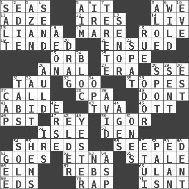 ACROSS 1. Oceans 5. Small island 8. Deep reverence 11. Edge tool used to cut and shape wood 12. Angers 14. 54 in ancient Rome 15. Climbing, woody, usually tropical vines 17. Female horse 18. Hero or heavy, e.g. 19. Watched over 21. Followed as a consequence or result 23. Globe 25. Drink excessively 26. Of or related to the anus 27. Epoch 28. Compass dir. 31. The 19th letter of the Greek alphabet 33. Thick or sticky substance 35. Drinks excessively 37. Give a ring to 38. Tax preparer (abbr.) 40. Do not 41. Stay 43. Federal power corp. 45. Baseball player Mel 46. Pacific Standard Time (abbr.) 47. Marina Del _, California 50. Russian composer Stravinsky 52. Small island 53. Lair 54. Fragments 56. Oozed 61. Leaves 62. Inactive volcano in Sicily 65. Having lost freshness 66. Shade tree 67. Confederate soldiers (slang) 68. Uhlan (variant) 69. Begley and Asner 70. Hit sharply and swiftly 71. Is not DOWN 1. Table seasoning 2. Singer Brickell 3. Muslim summons to prayer 4. Post 5. Direct toward a target or goal 6. Retirement account (abbr.) 7. Cylindrical with tapered ends 8. Medicinal plant 9. Uncontrolled 10. First lady 13. Sir (Sp.) 16. A really long time 18. Sorrow 20. To trail on the ground 22. Petty quarrel 24. Alliance 26. Old (Scot.) 28. Specific locale 29. Transmitted 30. Eastern Standard Time (abbr.) 31. Bar bills 32. Came down and settled, as after flight 34. Elect 36. Scent 37. Head covering 39. Enthusiastic 42. Celtic language 44. Eras 48. A person who is older than you are 49. Next before 51. Washington bills 52. Big collection agency 54. Exchanged or delivered for money 55. Cloth borders 57. Needle holder 58. Friends 59. Liveliness 60. Incision 61. Turn to the right 63. Basketball assoc. 64. Cleo's killer