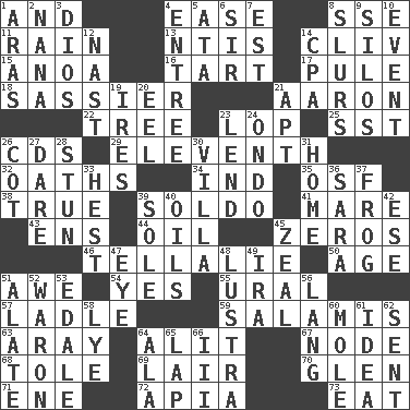 ACROSS 1. Also 4. Comfort 8. Compass dir. 11. Precipitation 13. Nuclear Threat Initiatives 14. 154 in Roman numerals 15. Small Philippine buffalo 16. Small pie 17. Whimper 18. More disrespectful 21. Composer Copland 22. Relationship diagram 23. Chop off 25. Fast jet (abbr.) 26. Music discs 29. Veterans Day date 32. Profane or obscene expressions 34. Indiana (abbr.) 35. Order of Saint Francis (abbr.) 38. Loyal 39. Twentieth part of a lira 41. Female horse 43. Followers of ems 44. Petroleum 45. Nothings 46. Copy Pinocchio 50. Grow older 51. Deep reverence 54. It is so 55. Mountain range 57. Dipping utensil 59. Deli grouping 63. Like ___ of sunshine 64. Set down 67. Thickened enlargement 68. Lacquered or enameled metalware 69. Den 70. Small, secluded valley 71. Compass dir. 72. Capital of Western Samoa 73. Ingest DOWN 1. Ancient river in northeast Turkey 2. Grandmother 3. "Vaya con ____" 4. Main course 5. _ moment's notice (2 wds.) 6. Title for a knight 7. Eastern Standard Time (abbr.) 8. Runs notes together 9. Grain storage towers 10. Incident 12. Political cartoonist Thomas 14. Numbers guy (abbr.) 19. Angers 20. Snakelike fish 21. Fitting 23. Grant temporary use of 24. Southwest Nigerian state 26. Small bed 27. Have the gumption 28. Surprise greatly 30. Country estate 31. Dwelling 33. Command 36. "Two Mules for Sister ____" 37. Tree-dwelling hopper 39. Not divided or shared with others 40. Lubricates 42. Compass dir. 45. Ardor 47. Sight organ 48. A period of five years 49. Retirement account (abbr.) 51. Having winglike extensions 52. Make _____ (do battle with) 53. Peak District village in England 56. Long (Scottish) 58. Sodium hydroxide 60. Undercover agent 61. It may be bright or harebrained 62. Emitted 64. In the manner of 65. Infant locale 66. One more than two