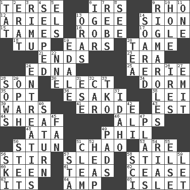 ACROSS 1. Laconic 6. Big collection agency 9. 17th letter of the Greek alphabet 12. Satellite of Uranus 13. Double curve, resembling the letter S 14. The Jewish people; Israel 15. Domesticates 16. Loose flowing garment 17. Stare at amorously 18. Uncastrated adult male sheep 19. Hearing organs 20. Not wild 21. Extremities 23. Epoch 24. Pulitzer Prize-winning author Ferber 25. Nest on high 28. Manchild 30. Choose 34. Dormintory (informal) 35. Choose 36. 1973 Nobel Price Winner (Physics) Leo 38. Flowery wreath 39. Armed conflicts 41. Wear away 43. Eastern Standard Time (abbr.) 44. To gather and bind into a bundle 46. High mountains 48. "One Day ___ Time" 49. Silvers or Donahue 50. Surprise greatly 51. US Secretary of Labor Elaine L. _ 53. "We ___ not amused" (Victoria) 56. Move through with a circular motion 57. Downhill vehicle 58. Not moving 60. Peachy ____! 61. Beverages made from leaves 62. Stop 63. It is 64. Electrical Unit 65. Small island DOWN 1. Make lace 2. Part of Q.E.F. 3. Tall New Zealand timber tree 4. Oozed 5. Raised railways 6. Composer Stravinsky 7. Confederate soldiers (slang) 8. Observe 9. Frustrating wastes of time 10. Opening into or through something 11. Single 13. Mouths or openings 14. Flew 19. Peak District village in England 20. Beverage made from leaves 22. Compass dir. 24. Pleas 26. Angers 27. Give off 28. Sty mamas 29. Brightly colored fish 31. Compass dir. 32. Automobile 33. Ring climax 37. Potato state 40. Titan orbits this 42. Biblical high priest 45. Air blower 47. Food holders 49. Groovy apts. 50. Proofreading order 51. Clement's nick name 52. Pile 54. Monetary unit of Yemen 55. Otherwise 56. What Jean-Claude Killy likes to do 57. R.R. building 58. _-fi 59. Allow
