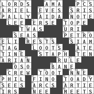 ACROSS 1. Titled peers of a realm 6. Wet nurse (var.) 9. Personal Computers (abbr.) 12. Satellite of Uranus 13. Nights before holidays 14. Indian titles of respect 15. Chummy 16. Opera by Verdi 17. Brief written record 18. Area sheltered from the wind 19. Celtic language 20. Drink excessively 21. It was, poetically 23. RI univ. 24. Oceans 25. Stone: prefix 28. Biblical high priest 30. Musical pauses 34. Thailand, formerly 35. Label 36. Plunders 38. Had dinner 39. Prong on a fork 41. Staphylococcus 43. "___ Little Indians" 44. Believer in; advocate of (suffix) 46. Governing power 48. Bear (Spanish) 49. Object of repulsion 50. Ship's personnel 51. A blast of a horn 53. Compass dir. 56. Silvers or Donahue 57. A pale, very dry sherry 58. Sycophant 60. Observes 61. Curves 62. Nick name for Arthur 63. Big collection agency 64. Born 65. Confronts DOWN 1. Pet locale 2. Relating to the mouth 3. Cause heat under the collar 4. Erase 5. Mischievous 6. Deliberation 7. Ancient Persian 8. White ___ sheet 9. Conciliate 10. Quote 11. Compass dir. 13. Hearing organs 14. Sounds asleep 19. Artist's stand 20. Uncastrated adult male sheep 22. Armed conflict 24. Seigniories (variant) 26. Pace 27. Sign of things to come 28. Singer James 29. Den 31. Mayday 32. Small child 33. R.R. building 37. Small fatty European fish 40. Artist's stands 42. Attila the _ 45. At this time 47. Poe poem 49. Scornful sounds 50. "Mermaids" star 51. Hoop that covers a wheel 52. At one time in the past 54. Nathan's nickname 55. Prepare for publication 56. Air pressure measure (abbr.) 57. Air blower 58. Scottish cap 59. Consenting reply