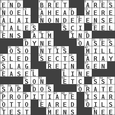 ACROSS 1. Conclusion 4. Cy Young winner Saberhagen 8. Ancient Greek god of war 12. Christmas carol 14. Toward the future 16. We are 17. Jai ____ 18. Unrelated to defense, as in spending 20. Lies 22. _-fi 23. Snakelike fish 24. Followers of ems 25. Direct toward a target or goal 28. Working for oneself (abbr.) 30. Centimeter-gram-second unit of force 31. Fertile tracts in a desert 35. Bear (Spanish) 37. Nuclear Threat Initiatives 40. Place where flour is made 41. Downhill vehicle 42. Religious groups 44. Like ___ of sunshine 45. Volcanic refuse 46. It's straight from the horse's mouth 47. Commissioned mil. rank 48. Artist's stand 50. Actor's bit 52. Manchild 54. And so on (abbr.) 55. Fast jet (abbr.) 58. Plant excrement 61. Two (Sp.) 63. Speak pompously 65. Conciliate 70. Austrian river, tributary to the Danube 71. Von Bismarck 72. Having ears or earlike features 73. Lubricates 74. Trial 75. Not women's 76. Born DOWN 1. Maternal 2. Pitcher Ryan 3. Allots cards 4. Forbid 5. 17th letter of the Greek alphabet 6. Car or cant ending 7. Small amounts or degrees 8. Deep reverence 9. French philosopher Descartes 10. Celtic language 11. Sew up the eyelids of hawks and falcons 13. Untruth 15. Tenth: prefix 19. A pale, very dry sherry 21. Declare 26. Taverns 27. Distance measurement 29. Break 30. Evades 32. Title for a man of rank and authority 33. Liveliness 34. Insidious 35. Spanish pot 36. Oceans 38. Frozen water 39. Vertical member of a panel or frame 41. Compass dir. 43. In a ____ (agitated or irritated) 49. Farming town in central California 51. Non-commissioned officer (abbr.) 53. Short letter 55. Indian antelope 56. Lacking originality or spontaneity 57. Laconic 58. Blemish 59. Johnson of "Laugh-In" 60. Cooking vessels 62. Thailand, formerly 64. River (Sp.) 66. Plant holder 67. "We ___ not amused" (Victoria) 68. Nine, plus one 69. Begley and Asner