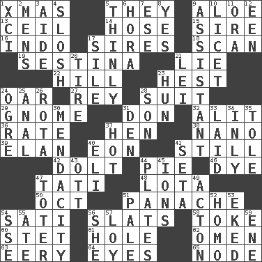 ACROSS 1. Dec. holiday 5. Those things 9. Medicinal plant 13. To provide with a ceiling 14. Stockings 15. Beget 16. Southeast Asian peninsula 17. Begets 18. Glance over 19. French poetic form 21. Untruth 22. Land elevation 23. Command 24. Boat paddle 27. Marina Del _, California 28. Costume for a special activity 29. Dwarf 31. Spanish title 32. Came down and settled, as after flight 36. Assign a rank or rating to 37. Layer 38. Billionth: prefix 39. Liveliness 40. Age 41. Free of sound 42. Dunce 44. Sliced dessert 46. Color 47. Jacques of French films 48. Globular water bottle used in Asia 50. Sep. follower 51. Flamboyance 54. Suttee (variant) 56. Narrow boards 58. Casino tip 60. Proofreading order 61. Opening into or through something 62. Sign of things to come 63. Suggestive of the supernatural 64. Sight organs 65. Thickened enlargement DOWN 1. One more than ninety 2. Not women's 3. Helper 4. Splash clumsily 5. Without thickness 6. Israeli folk dance 7. Compass dir. 8. It is so 9. Aide 10. It is permitted: Lat. 11. Mouth or opening 12. Car or cant ending 17. Filth; sediment 20. Hoop that covers a wheel 21. Luau accessory 23. Attila the _ 24. Legendary monster 25. Of or related to the anus 26. Roll call or roster of names 28. Manchild 30. Ananias' fault 31. Lair 33. Put down 34. In an inward manner 35. Lacquered or enameled metalware 37. Being at a high temperature 40. Biblical high priest 41. Bristle 43. Baseball player Mel 44. Food holders 45. Charged atoms 47. Carrier 49. NE Massachussets city 51. Diluted with white 52. Like (prefix) 53. Made supply last 54. Compass dir. 55. Had dinner 56. A female animal or person 57. Myrna of the movies 59. Compass dir.