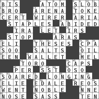 ACROSS 1. Again 4. Tiny particle 8. Messy guy 12. Sis' sibling 13. Sports stadium 14. Casino tip 15. An absolute certainty 17. One who wires 18. Operatic vocal solo 19. Paper fasteners 21. Remained 23. Lyricist Gershwin 24. Allow 26. Big collection agency 27. Halt 28. Caspian sea tributary 30. Biblical high priest 31. College papers 34. Numbers guy (abbr.) 37. "Barney Miller" actor Jack 38. Table seasonings 39. Petroleum 40. Car or cant ending 41. Place for singles 42. Cartoonist voice _ Blanc 43. "Corrida" creature 44. Balmoral and tarboosh 46. For each 47. Fast jet (abbr.) 50. Bear (Spanish) 51. Flew 54. Yearning 57. Writer Wiesel 58. Peak District village in England 60. Vintage cars 62. Left 63. Impressive in appearance 64. Compass dir. 65. Characteristic smell of wine 66. Backtalk 67. Nine, plus one DOWN 1. English channel? 2. Angers 3. Making a chance decision by using lots 4. Satellite of Uranus 5. Laconic 6. Single 7. Hindu Mythology: god of death 8. Flight of steps 9. Titled peers of a realm 10. Migrant worker of the '30s 11. Necklace unit 13. Leather borer 16. Pacific island yam 20. Infant food 22. Prejudice 25. Clothes sense 27. A type of plum 29. Take ten 30. Compass dir. 31. Russian ruler of old 32. Auras 33. Pipe bend 34. Piece 35. Sliced desserts 36. 100% 41. Had on 43. Cylindrical with tapered ends 44. Gear tooth 45. SW Saudi Arabia district 46. Aches 48. Thick slices 49. For Whom the Bell _____ 51. Stitched 52. Butter sub 53. Hiding places for outlaws 55. Born 56. Went 59. ___ good deed 61. Elected rep.