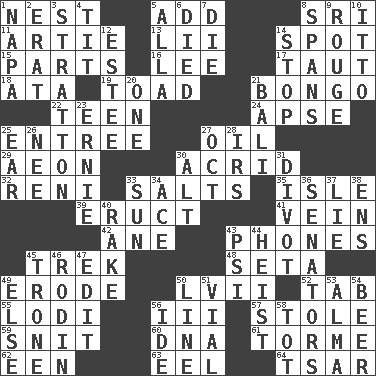 ACROSS 1. A home for chicks 5. Increase 8. Indian title of respect (Mr.) 11. Nick name for Arthur 13. Cards in a Roman deck? 14. Specific locale 15. Pieces 16. Area sheltered from the wind 17. Strained 18. "One Day ___ Time" 19. Frog relative 21. Beat drum 22. Adolescent 24. Domed church section 25. Main course 27. Petroleum 29. A really long time 30. Bitter 32. Painter Guido (1575-1642) 33. Table seasonings 35. Capri or Wight 39. Spew [out] 41. Distinctive style or manner 42. A saturated hydrocarbon 43. Gives a jingle 45. Long journey 48. Stalk of a moss capsule 49. Eat (away) 50. 57 in ancient Rome 52. Bar bill 55. Farming town in central California 56. One more than two 57. Took without asking 59. In a ____ (agitated or irritated) 60. Heredity factor (abbr.) 61. Singer Mel 62. Car or cant ending 63. Snakelike fish 64. Russian ruler of old DOWN 1. California wine valley 2. Part of Q.E.F. 3. Ski resort town in Vermont 4. Teat (slang) 5. Silent film actress Nazimova 6. Passed on 7. Pass on 8. Connects, as a bridge 9. Makeup applied to the cheeks 10. "Tell ____ the Marines!" 12. First name in cosmetics 14. Close up, plug up 20. Single 21. Indonesian resort city 23. Bert's buddy 25. Ewer handle 26. Born 27. Sep. follower 28. Big collection agency 30. The first octave above the treble staff 31. A piece of turf (Scot.) 33. Player for Phoenix 34. Adept person 36. Legislators 37. Untruth 38. Followers of ems 40. Libertine 43. 23rd letter of the Greek alphabet 44. Robbery 45. Marketplace scale 46. "The Thinker" sculptor 47. Prepare for publication 49. Otherwise 50. Actor's bit 51. Small bottle 53. _ mater 54. Fermented drink made from hops 56. Binary compound 58. Small child