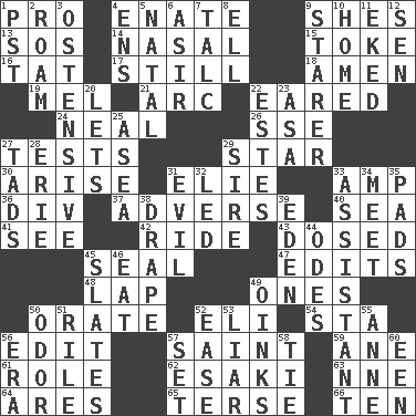 ACROSS 1. Adept person 4. Maternal 9. "______ My Girl" (Turtles hit) 13. Distress signal 14. Relating to the nose 15. Casino tip 16. Make lace 17. Free of sound 18. So be it 19. Cartoonist voice _ Blanc 21. Curve 22. Having ears or earlike features 24. Be tempered by heat 26. Compass dir. 27. Trials 29. Play the lead 30. Get up 31. Writer Wiesel 33. Electrical Unit 36. HTML Container Element 37. Contrary to your interests or welfare 40. Ocean 41. Observe 42. Travel on an animal 43. Administered medicine 45. Lick closed 47. Proofreads 48. Pet locale 49. Washington bills 50. Speak pompously 52. Connecticut Ivy Leaguer 54. R.R. building 56. Prepare for publication 57. Virtuous person 59. One (Scot) 61. Hero or heavy, e.g. 62. 1973 Nobel Price Winner (Physics) Leo 63. Compass dir. 64. Ancient Greek god of war 65. Laconic 66. Nine, plus one DOWN 1. Pacific Standard Time (abbr.) 2. Wander aimlessly 3. Clearly or manifestly demonstrative 4. Followers of ems 5. Brizilian seaport 6. SW Saudi Arabia district 7. Baby powder 8. Pipe bend 9. A viewer who gazes fixedly 10. Residence 11. Supplemented with great effort 12. Elected rep. 20. Allows 22. _____ Park, CO 23. White ___ sheet 25. At sea 27. Small amounts or degrees 28. One of the Great Lakes 29. Father 31. Tending to cause great harm 32. Directed 33. Helper 34. Confront 35. Groovy apts. 38. Window treatment 39. Locale of original sin 44. Lyric poems 45. Chalkboards 46. Erode 49. Pig sounds 50. Scent 51. Cause heat under the collar 52. Relaxation 53. One who doesn't tell the truth 55. Singer Murray 56. Epoch 57. Arrange properly for use 58. Make a knot 60. Car or cant ending