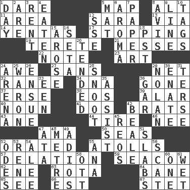 ACROSS 1. Have the gumption 5. Atlas unit 8. The first octave above the treble staff 11. Type of rug 12. "Two Mules for Sister ____" 13. By way of 14. Gossips 17. Ceasing 19. Cigar-shaped 21. Makes clutter 22. Make mention of 23. Tate display 24. Deep reverence 27. Without 29. Fish or hair follower 32. The wife of a rajah (variant) 34. Heredity factor (abbr.) 36. Went 37. Celtic language 38. Greek goddess of the dawn 39. Having or resembling wings 40. Part of speech 41. Two (Sp.) 42. Naughty children 43. A saturated hydrocarbon 44. Hoop that covers a wheel 46. Born 47. Wet nurse (var.) 50. Oceans 52. Declaimed 55. Ringlike coral islands and reefs 57. Conveyance 59. Manatee 62. Compass dir. 63. Round or rotation of duties 64. Object of repulsion 65. Perceive with the eye 66. Eastern Standard Time (abbr.) 67. Proofreading order DOWN 1. 24 hours 2. "We ___ not amused" (Victoria) 3. Monthly bill 4. Ingested 5. Floor covering 6. Odor 7. Some stationery 8. Deliberation 9. Actor's bit 10. Labels 12. Compass dir. 15. Came up 16. Stalk of a moss capsule 18. Pacific Standard Time (abbr.) 20. Looked after 24. Sports stadium 25. Make _____ (do battle with) 26. Follow as a consequence or result 28. Snout, nose 29. Pitcher Ryan 30. Related on the mother's side 31. Laconic 33. Car or cant ending 35. Help 36. Slender fish 42. Memphis, Tenn. Street 45. Vintage cars 47. _ moment's notice (2 wds.) 48. Distance measurement (Brit.) 49. Goodbye (Sp.) 51. Broad, flat, thick pieces 52. Lyric poems 53. French philosopher Descartes 54. Toward shelter 55. Santa ___, CA 56. Scram, to a cat 58. Baseball player Mel 60. Single 61. Soggy