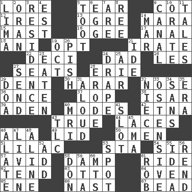 ACROSS 1. Old wives' tales, e.g. 5. Pull apart 9. Small bed 12. Angers 13. Legendary monster 14. Hindu Mythology: god of death 15. Vertical spar for supporting sails 16. Double curve, resembling the letter S 17. Of or related to the anus 18. Cuckoo 19. Choose 21. Feeling or showing extreme anger 22. Tenth: prefix 24. Male parent 26. French article 27. Theater features 28. One of the Great Lakes 29. Scratch 30. Ethiopian city, capital of Harari 32. Characteristic smell of wine 36. Single time 37. Trim (branches) 38. Austrian river, tributary to the Danube 39. An important port of Yemen 40. Methods 42. Inactive volcano in Sicily 43. Loyal 44. Shoestrings 46. Chicken ___ king 49. Flaplike covering 50. Presage 51. Pale purple color 53. R.R. building 54. Title for a knight 57. Enthusiastic 58. Moist 61. Travel on an animal 62. Watch over 63. Von Bismarck 64. Baking chamber 65. Compass dir. 66. Political cartoonist Thomas 67. Necklace unit DOWN 1. Pale green bean 2. Northwest Algerian city 3. Home 4. Eastern Standard Time (abbr.) 5. A blast of a horn 6. Oval reproductive body of a fowl 7. "We ___ not amused" (Victoria) 8. To sift 9. Lessep's creation 10. Speak pompously 11. Stories 14. Make imperfect 19. Sep. follower 20. Expression of disdain 21. Binary compound 23. Consumed 24. Window treatment 25. Wind 27. Transmit 28. Eat (away) 29. ___ good deed 31. Verbally 32. Sibling's daughter 33. Clearly or manifestly demonstrative 34. Without 35. Period 40. Medical imaging device (abbr.) 41. Groove 43. Affectionate concern, for short 45. Housemaid (var.) 46. Having winglike extensions 47. Make or become more lively 48. Place in a line 52. Find the sum of 53. Specific locale 55. It may be bright or harebrained 56. Tear apart 58. Spanish title 59. _ moment's notice (2 wds.) 60. Mountains (abbr.) 61. Director Reiner