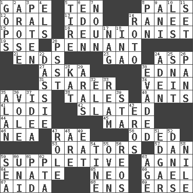 ACROSS 1. Open wide 5. "___ Little Indians" 8. Friends 12. Of the mouth 13. Wedding promise 14. Indian princess (variant) 15. Plant holders 16. One who advocates reunion 19. Compass dir. 20. Pre-World Series prize 21. Extremities 23. E Mali city 24. Cleo's killer 27. "____ silly question..." 30. Pulitzer Prize-winning author Ferber 31. A viewer who gazes fixedly 34. Distinctive style or manner 35. Deliberation 38. Stories 40. Pismires 41. Farming town in central California 42. Scheduled 44. Toward shelter 45. Female horse 46. Teachers' org. 47. Actress Charlotte 50. Wrote a lyric poem 53. Speakers 57. One of the 12 tribes of Israel 59. Supplementary 63. Hindu god of fire 64. Maternal 65. Modern: prefix 66. Highlander 67. Opera by Verdi 68. Followers of ems 69. Celtic language DOWN 1. Republicans 2. Came up 3. Eucharist need 4. Raised railways 5. Hoop that covers a wheel 6. Paradise 7. Part of speech 8. Baking dish 9. Black tropical American cuckoo 10. French article 11. Put into a specified state 14. Printing process, for short 17. Tired old horse 18. _ tizzy (2 wds.) 20. Inconspicuous attention getter 22. Hyrax 24. An important port of Yemen 25. In a ____ (agitated or irritated) 26. Baking dishes 28. Krazy ___ of comics 29. Caspian sea tributary 30. Dodged 32. Pipe bend 33. 480, 500 or 516 sheets of paper 35. Actor Alda or Thicke 36. Grand slam 37. The content of cognition 39. R.R. building 43. Greek god of love 47. Hero or heavy, e.g. 48. "We ___ not amused" (Victoria) 49. Consume 51. _ Allan Poe 52. Natives or inhabitants of Denmark 54. Prong on a fork 55. Baking chamber 56. Vintage cars 58. Mediterranean tributary 59. Ocean 60. Corn or form start 61. Writing tablet 62. Parent Teacher Assoc. 63. Grow older