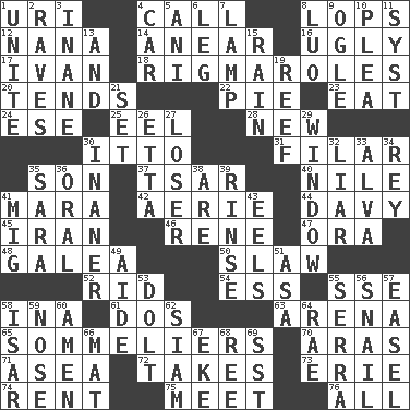 ACROSS 1. RI univ. 4. Give a ring to 8. Chops off 12. Nanny 14. Approach 16. Repulsive 17. "Terrible" tsar 18. Complicated, petty procedures 20. Watches over 22. Sliced dessert 23. Erode 24. Compass dir. 25. Snakelike fish 28. ___ Haven, CT 30. "Tell ____ the Marines!" 31. Having threads 35. Manchild 37. Russian ruler of old 40. Mediterranean tributary 41. Hindu Mythology: god of death 42. Nest on high 44. _ Jones' Locker 45. SW Asia republic 46. French philosopher Descartes 47. Mouth or opening 48. An organ shaped like a helmet 50. Cole _ (cabbage dish) 52. To free from 54. Curvy letter 55. Compass dir. 58. _ tizzy (2 wds.) 61. Two (Sp.) 63. Sports stadium 65. Wine waiters 70. Ancient river in northeast Turkey 71. At sea 72. Receives possession of 73. One of the Great Lakes 74. Monthly bill 75. Confront 76. 100% DOWN 1. Join together 2. All-night dance parties 3. Lacking in sense or substance 4. 4-wheeled motor vehicle 5. Cuckoo 6. Part of a journey 7. Desk light 8. Nilotic language 9. Stare 10. Entreaty 11. System (abbr.) 13. Added to 15. Precipitation 19. Coral ridge 21. Arrange properly for use 26. Singer James 27. Failure 29. Light entry point 30. More empty; more void 32. One who doesn't tell the truth 33. Inventor's middle name 34. Marina Del _, California 35. "Two Mules for Sister ____" 36. Spoken 38. "We ___ not amused" (Victoria) 39. Wash lightly 41. Russian fighter aircraft 43. Snakelike fish 49. Assistant 51. White ___ sheet 53. Stupid person 55. Spanish missionary in California 56. Slow-paced one 57. Artist's stand 58. Austrian river, tributary to the Danube 59. Olfactory organ 60. So be it 62. Thailand, formerly 64. Actress Charlotte 66. Floor protector 67. Make supply last 68. To riddle 69. Fast jet (abbr.)
