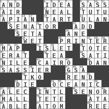 ACROSS 1. Added to 4. The main thing one is thinking about 8. Backtalk 12. Atmosphere 13. Actress Patricia 14. Ballerina skirt 15. Bee-related 18. Small pie 19. ____ Bator, Mongolia 20. Elected representative 22. Find the sum of 23. Bristle 24. A saturated hydrocarbon 25. Soggy 26. Hard copy producer 30. Atlas unit 33. Small island 36. Carryall 37. Part of Q.E.F. 39. Afternoon social gathering 40. Suttee (variant) 41. Mediterranean tributary 42. Capital of Egypt 44. One of the 12 tribes of Israel 45. More impudent 47. Girls' org. (abbr.) 50. Ring climax 51. Tear apart 53. Pass on 54. Pertaining to the sea 57. Actor Baldwin 59. International (abbr.) 61. Sir (Sp.) 63. Promenade 64. Wig 65. _ moment's notice (2 wds.) 66. Competent 67. Smallest unit of an element 68. To riddle DOWN 1. Auto club (abbr.) 2. Cuts off 3. Frees from moisture 4. To the inside or interior of 5. Letter starter 6. Hearing organ 7. The first octave above the treble staff 8. SAT takers 9. Old (Scot.) 10. R.R. building 11. Player for Phoenix 16. Afresh 17. Nathan's nickname 21. Jacques of French films 22. Cuckoo 24. Nonscientific branch of learning 26. Lightbulb-shaped fruit 27. Frog relative 28. Singer James 29. It's straight from the horse's mouth 30. Not women's 31. Roberta Peters solo 32. Friends 34. Play the lead 35. Flowery wreath 38. A testis 42. Corporate head (abbr.) 43. Legendary monster 46. D.D.E's nickname 48. Oceans 49. Queen of England 1702-14 52. Middle Eastern gold or silver currency 53. Small valley 54. "Beetle Bailey" pooch 55. Clement's nick name 56. ____ d'Azur (French Riviera) 57. Nanny (var.) 58. Experiment locale 59. Call ___ day 60. Remaining after all deductions 62. Actress Charlotte