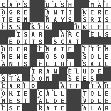 ACROSS 1. Balmoral and tarboosh 5. Food container 9. Floor protector 12. Legendary monster 13. Opposed to 14. Past tense of be (plural) 15. Adolescent 16. Negative votes 17. Indian titles of respect 18. Double-curved letter 19. Cask 21. A small or young owl 22. Austrian river, tributary to the Danube 24. Curve 26. Raised railways 27. Proofreads 28. Scram! 29. Baltic tributary 30. Maternal 32. Detail 36. French philosopher Descartes 37. Bear (Spanish) 38. Flatfish 39. Pismires 40. Talk or behave amorously 42. Move on water 43. SW Asia republic 44. Evade 46. R.R. building 49. Spanish title 50. Observes 51. Monte _, Las Vegas Hotel/Casino 53. Had dinner 54. Keyboard key 57. Migrant worker of the '30s 58. Give a ring to 61. Lacquered or enameled metalware 62. A home for chicks 63. _ vera 64. Short-tailed, large-bodied rat 65. Compass dir. 66. Assign a rank or rating to 67. Having or resembling wings DOWN 1. ____ d'Azur (French Riviera) 2. Eons 3. Elected leader of a country 4. Elected rep. 5. Mild oath, euphamism for damn 6. _ tizzy (2 wds.) 7. Filthy place 8. Part of HMS, perhaps 9. Haggard of country music 10. Satellite of Uranus 11. Trials 14. Compass dir. 19. Krazy ___ of comics 20. Celtic language 21. Sep. follower 23. Male parents of animals 24. Thespian 25. Actress Charlotte 27. Genesis locale 28. Indian antelope 29. Mouth or opening 31. Pitcher Ryan 32. Come out of 33. Inedible or poisonous agaric 34. Writer Wiesel 35. Cartoonist voice _ Blanc 40. From 41. Trial 43. Wedding promise 45. Area sheltered from the wind 46. Biscuitlike quick bread 47. Proceeds 48. Ascend 52. Allow 53. Toward shelter 55. Silent film actress Nazimova 56. Fermented drink made from hops 58. Automobile 59. Chicken ___ king 60. Car dealer's back yard 61. Federal power corp.