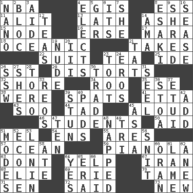ACROSS 1. Basketball assoc. 4. The front part of a cuirass 8. Double-curved letter 11. Set down 13. Thin strip of wood or metal 14. American tennis player Robert 15. Thickened enlargement 16. Celtic language 17. Hindu Mythology: god of death 18. Pertaining to the sea 21. Receives possession of 22. Set or collection 23. Beverage made from leaves 25. Binary compound 26. Fast jet (abbr.) 29. What propaganda does 32. Dinah or Pauly 34. Friend of Pooh 35. Compass dir. 38. Past tense of be (plural) 39. Arguments over trivial matters 41. Singer James 43. "Barney Miller" actor Jack 44. Small amount or degree 45. Verbally 46. SAT takers 50. Assist 51. Cartoonist voice _ Blanc 54. Followers of ems 55. Ancient Greek god of war 57. Sea 59. Player piano 63. Do not 64. Sharp bark 67. SW Asia republic 68. Writer Wiesel 69. 4th largest of the Great Lakes 70. Not wild 71. Elected rep. 72. Expressed in words 73. ___ Haven, CT DOWN 1. Billionth: prefix 2. Coalition 3. Helper 4. Opts 5. Slender fish 6. ___ a Wonderful Life 7. A female animal or person 8. 1973 Nobel Price Winner (Physics) Leo 9. Fragment 10. Gospel singer Marvin 12. Afternoon social gatherings 14. Nanny (var.) 19. Unadorned 20. One more than two 21. Make lace 23. A blast of a horn 24. Greek god of love 26. Compass dir. 27. "______ My Girl" (Turtles hit) 28. "Corrida" creature 30. Swap 31. Sew up the eyelids of hawks and falcons 33. Vintage cars 36. Portico 37. Needle holder 39. Surprise greatly 40. Groovy apts. 42. Find the sum of 45. Toward the sea 47. "___ Little Indians" 48. Slept 49. Three (prefix) 51. Methods 52. Learning spot: Fr. 53. Soviet premier 1918-24 56. In a ____ (agitated or irritated) 58. Had dinner 60. NW Algerian seaport 61. Unable to walk 62. Afresh 64. Affirmative reply 65. Epoch 66. Cards in a Roman deck?
