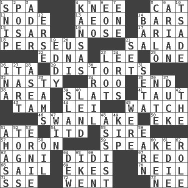 ACROSS 1. Health resort 4. Leg joint 8. Feline 11. Thickened enlargement 13. Age 14. Long, evenly shaped pieces 15. Austrian river, tributary to the Danube 16. Characteristic smell of wine 17. Operatic vocal solo 18. Son of Zeus who helped slay Medusa 21. Vegetable dish 22. Pulitzer Prize-winning author Ferber 23. Area sheltered from the wind 25. Single 26. Call ___ day 29. What propaganda does 32. Offensive 34. Friend of Pooh 35. Conclusion 38. Type of rug 39. Narrow boards 41. Drawn tight 43. Scottish cap 44. Flowery wreath 45. Timepiece 46. Tchaikovsky ballet 50. Make supply last 51. Had dinner 54. It would 55. Title for a man of rank and authority 57. Person of subnormal intelligence 59. Orator 63. Hindu god of fire 64. "You Light Up My Life" star Conn 67. Do over again 68. Travel by water 69. Makes supply last 70. Famous astronaut Armstrong 71. Compass dir. 72. Gone 73. Born DOWN 1. Clip 2. Introduce or present, as a question 3. The sixth month of the Jewish calendar 4. Sunflower state 5. Modern: prefix 6. Greek goddess of the dawn 7. Compass dir. 8. Monte _, Las Vegas Hotel/Casino 9. Believer in; advocate of (suffix) 10. Sadhe (variant) 12. Celtic language 14. Sound made by sheep 19. Whirlpool 20. Corn or form start 21. Put into a specified state 23. Plunder 24. Greek god of love 26. _ tizzy (2 wds.) 27. Small pie 28. At sea 30. Hang back 31. Bristle 33. Scottish caps 36. Nathan's nickname 37. Evade 39. Narrow board 40. Grant temporary use of 42. Definite Article 45. We are 47. Acquire through effort 48. Aid 49. Monetary unit of Laos 51. Collect or gather 52. Ancient Roman robes 53. Bert's buddy 56. Merit 58. Petroleum 60. Peachy ____! 61. Singer Brickell 62. Hero or heavy, e.g. 64. Morning condensation 65. Mamie's husband 66. Lair