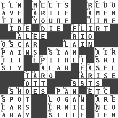 ACROSS 1. Shade tree 4. Confronts 9. Make new 13. "___ Maria" 14. Nick name for Arthur 15. So be it 16. Shallow baking pan 17. You are 18. Prong on a fork 19. Binary compound 21. Expire 22. Seductive woman who exploits men 24. Toward shelter 26. River (Sp.) 27. Motion picture award 29. (Had) reclined 30. Aches 31. Thailand, formerly 33. Wind 36. Teat (slang) 37. Curse 40. Indian title of respect (Mr.) 41. Cunning 42. Having or resembling wings 43. Artist's stand 45. Edible starchy tuberous root 47. Originate 48. Baseball player Mel 49. Fast planes 50. Imelda's hoard 52. Baking dish 54. And so on (abbr.) 56. Blemish 57. Utah city north of Ogden 59. "We ___ not amused" (Victoria) 61. Hearing organs 62. Bert's buddy 63. Modern: prefix 64. Like ___ of sunshine 65. Vertical member of a panel or frame 66. "___ Little Indians" DOWN 1. Erode 2. 57 in ancient Rome 3. Ananias' fault 4. Can I? 5. Wear away 6. Needle case 7. Become fatigued 8. Perceive with the eye 9. Food allowance for one day 10. Arab leader 11. Scratch 12. Single 20. Style 22. Movie unit 23. Cards in a Roman deck? 25. Celtic language 27. Elects 28. Travel by water 29. Cowardly lion portrayer 31. Grain storage tower 32. Call ___ day 33. Helper 34. Angers 35. Cause heat under the collar 38. Actors' quests 39. Beverages made from leaves 44. Johnson of "Laugh-In" 45. A girl or young woman (variant) 46. Had dinner 49. Slow-paced one 50. Coast Guard woman 51. Israeli folk dance 52. Left side of a ship or aircraft 53. Hindu god of fire 55. Algonquian 56. Ocean 57. French article 58. Born 60. Age