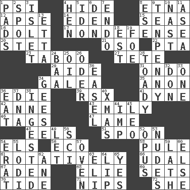 ACROSS 1. 23rd letter of the Greek alphabet 4. Flintstone garb 8. Inactive volcano in Sicily 12. Domed church section 14. Paradise 15. Oceans 16. Dunce 17. Unrelated to defense, as in spending 20. Proofreading order 21. Bear (Spanish) 22. Parent Teacher Association (abbr.) 23. Off limits 27. False hair 29. Assistant 31. Southwest Nigerian state 34. An organ shaped like a helmet 35. Soon (poet.) 36. Singer Brickell 39. Acura sports coupe 41. Centimeter-gram-second unit of force 42. Queen of England 1702-14 43. Poet Dickinson 46. Labels 47. Unable to walk 48. Snakelike fish 51. Soup utensil 54. Raised railways 56. Environmental prefix 58. Whine 61. Producing rotation 66. Hereditary estate 67. An important port of Yemen 68. Writer Wiesel 69. Puts into a specified state 70. Event that recurs at intervals 71. Pinches, bites 72. A female animal or person DOWN 1. Writing tablets 2. Specific locale 3. Small island 4. Layer 5. Wedding promise 6. Lair 7. Inside; within (prefix) 8. Compass dir. 9. 3-inch nail 10. Political cartoonist Thomas 11. Toward the sea 13. Singer James 18. Eastern Standard Time (abbr.) 19. Enemy 24. Sound made by sheep 25. Petroleum 26. Baltic tributary 28. Sycophant 30. Artist's stand 32. Spanish title 33. Single 34. Honkers 36. Consume 37. Heredity factor (abbr.) 38. Eaten 40. Dec. holiday 44. Mischievous child 45. Lion 49. Allow 50. _-fi 52. Musical composition 53. Unadorned figures 54. Part of Q.E.F. 55. Farming town in central California 57. Baking chamber 59. Thin strip of wood or metal 60. Otherwise 62. One (Scot) 63. Biblical high priest 64. Mouth edge 65. Affirmative reply