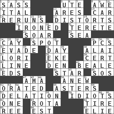 ACROSS 1. Backtalk 5. Shoshoni 8. Deep reverence 11. Slanted text style (abbr.) 12. Ancient Greek god of war 13. Auto 14. Summer TV shows 17. What propaganda does 19. Pressed 21. Cigar-shaped 22. Fly high 23. Ocean 24. Island 27. Blemish 29. Personal Computers (abbr.) 32. Dodge 34. 24 hours 36. Jai _ 37. Australian parrot (variant) 38. Make supply last 39. Foregone conclusion 40. Actor's bit 41. Lair 42. Calif. Air Force Base 43. Begley and Asner 44. Play the lead 46. Mayday 47. Wet nurse (var.) 50. Afresh 52. Spoke pompously 55. Michaelmas daisies 57. Conveyance 59. Foolish or stupid persons 62. Single 63. Roll call or roster of names 64. Hoop that covers a wheel 65. To separate or throw off 66. Eastern Standard Time (abbr.) 67. Writer Wiesel DOWN 1. Title for a knight 2. Had dinner 3. Indian skirt 4. Disparaging remarks 5. RI univ. 6. Trials 7. First name in cosmetics 8. 43,560 square feet 9. Electrical Unit 10. Celtic language 12. Find the sum of 15. Trap for birds or small mammals 16. Fastener 18. Mouth or opening 20. Worn away 24. Cell (Danish) 25. Prevent the occurrence of 26. Entertaining tales 28. Proceeds 29. Entreaties 30. Monte _, Las Vegas Hotel/Casino 31. Settings 33. Pass on 35. Gossips 36. Adept person 42. A special lineage 45. Against 47. _ moment's notice (2 wds.) 48. Distance measurement (Brit.) 49. Goodbye (Sp.) 51. Compose 52. Aroma 53. French philosopher Descartes 54. Toward shelter 55. Santa ___, CA 56. The visible part of the earth's surface 58. Baseball player Mel 60. Three (prefix) 61. Observe