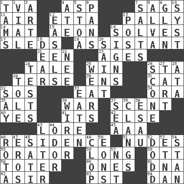 ACROSS 1. Federal power corp. 4. Cleo's killer 7. Droops 11. Wind 12. Singer James 13. Friendly 14. Floor protector 15. Period of immesurable duration 16. Finds the solution 17. Bobsleighs 19. Helper 21. Car or cant ending 23. Grows older 24. Story 25. Victory 26. R.R. building 29. Laconic 30. Followers of ems 31. Feline 32. Mayday 33. Ingest 34. Mouth or opening 35. The first octave above the treble staff 36. Armed conflict 37. Aroma 40. Affirmative reply 41. ___ a Wonderful Life 42. Otherwise 43. Old wives' tales, e.g. 45. Auto club (abbr.) 46. Home 51. Unclothed pictures 55. Speaker 56. Protracted 58. Baseball player Mel 59. Carrier 60. Singles 61. Heredity factor (abbr.) 62. SW Saudi Arabia district 63. Pacific Standard Time (abbr.) 64. Daniel's nick name DOWN 1. Scottish caps 2. Small bottle 3. Johnson of "Laugh-In" 4. Had dinner 5. Portico 6. Zero-star reviews 7. Table seasonings 8. Inventor's middle name 9. Small, secluded valley 10. System (abbr.) 12. Artist's stands 13. Introduce or present, as a question 16. Omens 18. Letter starter 20. Virtuous person 22. Born 24. Trials 25. Erodes 26. Biscuitlike quick bread 27. Small pie 28. "One Day ___ Time" 29. Lacquered or enameled metalware 32. Declare 33. Consumed 36. One who wires 37. Ocean 38. Gives out a loud, resonant sound 39. He sold his birthright 43. 61 cubic inches 44. Aroma 46. Roll call or roster of names 47. Greek god of love 48. Suttee (variant) 49. Hoof sound 50. Immeasurably long periods of time 52. Texas town _ City 53. Inactive volcano in Sicily 54. Comedian Laurel of Laurel & Hardy 57. Remaining after all deductions