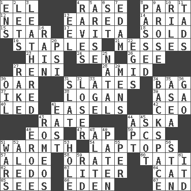 ACROSS 1. Pipe bend 4. To erase 8. Component 12. Born 13. Having ears or earlike features 14. Operatic vocal solo 15. Play the lead 17. Webber/Rice musical 18. Disposed of to a purchaser 19. Paper fasteners 21. Makes clutter 23. Part of HMS, perhaps 24. Elected rep. 26. Unit of force equal to gravity 27. Painter Guido (1575-1642) 28. Among 30. Boat paddle 31. Chalkboards 34. Paper or plastic container 37. D.D.E's nickname 38. Utah city north of Ogden 39. White ___ sheet 40. Directed 41. Artist's stands 42. Corporate head (abbr.) 43. Assign a rank or rating to 44. "____ silly question..." 46. Greek goddess of the dawn 47. Strike 50. Personal Computers (abbr.) 51. Heat 54. Portable computers 57. Medicinal plant 58. Speak pompously 60. Jacques of French films 62. Redecorate 63. 61 cubic inches 64. Domesticated feline 65. Perceives with the eye 66. Paradise 67. Conclusion DOWN 1. Followers of ems 2. Allows 3. Resembling or made to resemble leather 4. All-night dance parties 5. Originate 6. Arrange properly for use 7. Dutch treat 8. Went by 9. Came up 10. Cause heat under the collar 11. Small boys 13. Snakelike fish 16. Water falling in drops from the sky 20. 23rd letter of the Greek alphabet 22. Armor plate that protects the chest 25. Relating to or accompanying birth 27. Immoral or dissolute person 29. Not women's 30. Petroleum 31. Narrow board 32. Failure 33. Mature 34. Keyboard key 35. At sea 36. E Mali city 41. Compass direction 43. Lover boys 44. Fitting 45. Highlander 46. Wear away 48. Having winglike extensions 49. Eucharist need 51. Armed conflicts 52. Toward shelter 53. Opening into or through something 55. For each 56. Comedian Laurel of Laurel & Hardy 59. To free from 61. It would