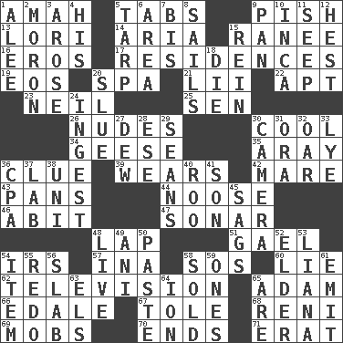 ACROSS 1. Nursemaid 5. Bar bills 9. Expression of disdain 13. Australian parrot (variant) 14. Operatic vocal solo 15. Indian princess (variant) 16. Greek god of love 17. Dwellings 19. Greek goddess of the dawn 20. Health resort 21. Cards in a Roman deck? 22. Fitting 23. Famous astronaut Armstrong 25. Elected rep. 26. Unclothed pictures 30. Calm and collected 34. Honkers 35. Like ___ of sunshine 36. A slight indication 39. Puts on (as clothing) 42. Female horse 43. Zero-star reviews 44. Trap for birds or small mammals 46. "This won't hurt ____!" 47. Echolocation 48. Pet locale 51. Highlander 54. Big collection agency 57. _ tizzy (2 wds.) 58. Mayday 60. Falsehood 62. Household entertainment appliance 65. First man 66. Peak District village in England 67. Lacquered or enameled metalware 68. Painter Guido (1575-1642) 69. Disorderly crowds 70. Extremities 71. Part of Q.E.F. DOWN 1. Toward shelter 2. Person of subnormal intelligence 3. Came up 4. Part of HMS, perhaps 5. Canvas cover 6. Type of rug 7. Twice 8. Moves on water 9. Baking dish 10. South American Indian 11. Ooze 12. Behest 15. It's straight from the horse's mouth 18. Expire 20. Turn sharply 24. Eat 27. Morning condensation 28. Compass dir. 29. Seines 30. Device for capturing images 31. Mouth or opening 32. Boat paddle 33. Potassium hydroxide 36. Tax preparer (abbr.) 37. Experiment locale 38. Corn or form start 40. Friend of Pooh 41. Male child 45. Droops 48. Not recorded 49. Cuckoo 50. Thick mixture 52. A person who is older than you are 53. Climbing, woody, usually tropical vines 54. A distinct part 55. Make new 56. Broad, flat, thick piece 58. Exchanged or delivered for money 59. Singles 61. Send forth 63. Raised railways 64. Electrically charged atom 65. "We ___ not amused" (Victoria)