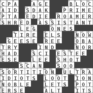 ACROSS 1. Tax preparer (abbr.) 4. Ripen 7. Alliance 11. Assist 12. Neighbor of Neb. 13. First class 14. Parent Teacher Assoc. 15. Singer Brickell 16. Wanderer 17. Fragment 19. Helper 21. Part of a journey 23. Washington bills 24. Become fatigued 25. Raised railways 26. Immediately 29. Honkers 30. To separate or throw off 31. Chief or king in Benin or Nigeria 32. Attempt 33. Indiana (abbr.) 34. And not 35. Possessed 36. _-fi 37. First name in cosmetics 40. Compass dir. 41. Area sheltered from the wind 42. Went for two points 43. Skim 45. "Barney Miller" actor Jack 46. Casting lots 51. Extremist 55. Foolish or stupid persons 56. Plunder 58. Electrically charged atom 59. Having high moral qualities 60. Allows 61. Cooking vessel 62. Celtic language 63. Keyboard modifier key 64. It is DOWN 1. Smile enhancers 2. Heart or essence 3. The sixth month of the Jewish calendar 4. Find the sum of 5. Greek goddess of the earth (variant) 6. Makes supply last 7. Naughty children 8. Pale green bean 9. Sign of something about to happen 10. Foregone conclusion 12. Spring feasts 13. Airs 16. Remove soap 18. Writer Wiesel 20. Having a sole or soles 22. Unit of force equal to gravity 24. Miss Universe 1986, Barbara Palacios _ 25. Bert's buddy 26. Music written for nine 27. Mitch Miller's instrument 28. Armed conflict 29. Pate de foie ____ 32. Definite Article 33. Ancient Celtic tribe of eastern Britain 36. Narrow boards 37. Curvy letter 38. Yells 39. Utensil 43. Took without asking 44. Quote 46. Trig term 47. Aroma 48. Chest bones 49. Water jar 50. Christmas carol 52. Native american tent (variation) 53. Carrot, for example 54. Pismires 57. Baseball player Mel