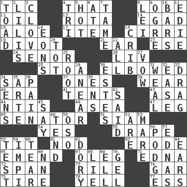 ACROSS 1. Affectionate concern, for short 4. Not this but _ 8. Ear part 12. Lubricate 13. Round or rotation of duties 14. Mild oath 15. Medicinal plant 17. A distinct part 18. High-altitude cloud 19. A piece of turf (Scot.) 21. Ewer handle 23. Compass dir. 24. Sir (Sp.) 26. 54 in ancient Rome 28. Portico 30. Shoved, as through a crowd 34. Plant excrement 37. Singles 39. Put on (as clothing) 40. Epoch 41. Portable shelters 43. White ___ sheet 44. Nuclear Threat Initiatives 46. Toward the sea 47. Part of a journey 48. Legislator 51. Thailand, formerly 54. It is so 55. Window treatment 58. Teat (slang) 61. Dreamland 63. Wear away 65. Make improvements or corrections to 67. Cassini of fashion 71. Pulitzer Prize-winning author Ferber 72. Connect, as a bridge 73. Cause heat under the collar 74. Slender fish 75. Become fatigued 76. Shout 77. Curvy letter DOWN 1. Frog relative 2. Ms. Damita and namesakes 3. Garlic unit 4. Three (prefix) 5. Being at a high temperature 6. Had dinner 7. Docile 8. Luau accessory 9. Legendary monster 10. Drinking establishments 11. Singer Brickell 16. Immeasurably long periods of time 18. Baby bed with high sides 20. Small child 22. 100% 25. Carrot, for example 27. Solemn pledge 29. Approach 30. _____ Park, CO 31. Welt 32. Comfort 33. To trail on the ground 34. Elected reps. 35. Johnson of "Laugh-In" 36. Ache 38. Followers of ems 42. Stated 45. Declare 49. Be inclined (to) 50. Bear (Spanish) 52. "We ___ not amused" (Victoria) 53. Female horse 56. Porridge 57. Ferber et al. 58. Trial 59. Body of Kaffir warriors 60. Separate forcefully 62. Dinghy 64. Hearing organs 66. Compass dir. 68. Falsehood 69. Pipe bend 70. Set