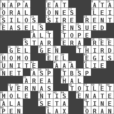 ACROSS 1. California wine valley 5. Erode 8. _ moment's notice (2 wds.) 11. Of the mouth 12. Washington bills 14. Flowery wreath 15. Grain storage towers 17. Father 18. Monthly bill 19. Artist's stands 21. Followed as a consequence or result 23. The first octave above the treble staff 25. Drink excessively 26. Play the lead 27. Period 28. Portuguese money of account (variant) 31. Set 33. Commissioned mil. rank 35. One of three equal parts 37. Same (prefix) 38. Snakelike fish 40. Armor plate that protects the chest 41. Join together 43. Auto club (abbr.) 45. Whopper 46. Remaining after all deductions 47. Cleo's killer 50. Cook's measure (abbr.) 52. Type of rug 53. Actor Linden 54. Actresses Bloom and Felton 56. Bathroom plumbing fixture 61. Undercover agent 62. Nuclear Threat Initiatives 65. Maternal 66. In the manner of 67. Stalk of a moss capsule 68. Prong on a fork 69. Writing instrument 70. Not strict 71. Northwest Algerian city DOWN 1. Characteristic smell of wine 2. Roberta Peters solo 3. Friends 4. Medicinal plant 5. Greek goddess of the dawn 6. Black tropical American cuckoo 7. Cigar-shaped 8. Toward shelter 9. Watch over 10. Small island 13. Sir (Sp.) 16. Narrow board 18. Sorrow 20. Volcanic refuse 22. Petty quarrel 24. Relationship diagram 26. Slit 28. Swiss mountan, "Queen of the Mountains" 29. 4th largest of the Great Lakes 30. Begley and Asner 31. Went 32. Give off 34. Teachers' org. 36. Assist 37. Attila the _ 39. Thin strip of wood or metal 42. Merit 44. Blind as ____ 48. Actors Connery and Penn 49. Soft color 51. _ gin 52. "We ___ not amused" (Victoria) 54. Grand slam 55. Style 57. To the inside or interior of 58. Den 59. Inactive volcano in Sicily 60. Adolescent 61. Atlas unit 63. Call ___ day 64. Saxophone