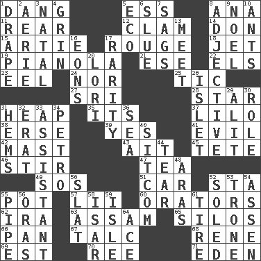 ACROSS 1. Mild oath, euphamism for damn 5. Curvy letter 8. Santa ___, CA 11. Hitchcock's "____ Window" 12. Dollar (slang) 14. Spanish title 15. Nick name for Arthur 17. Makeup applied to the cheeks 18. Passenger plane 19. Player piano 21. Compass dir. 22. Raised railways 23. Snakelike fish 24. Or not 25. Nervous spasm 27. _ Lanka 28. Play the lead 31. Pile 35. It is 37. _ and Stitch 38. Celtic language 39. It is so 41. Tending to cause great harm 42. Vertical spar for supporting sails 43. Small island 45. Wig 46. Disorderly outburst 47. Beverage made from leaves 49. Distress signal 51. Auto 52. R.R. building 55. Plant holder 57. Cards in a Roman deck? 60. Speakers 62. Lyricist Gershwin 63. Indian state 65. Grain storage towers 66. Baking dish 67. Baby powder 68. French philosopher Descartes 69. Eastern Standard Time (abbr.) 70. Portuguese money of account (variant) 71. Locale of original sin DOWN 1. Window treatment 2. Nest on high 3. Relating to or accompanying birth 4. Broad smile 5. Environmental prefix 6. Turn sharply 7. Sinks 8. Descriptive word 9. Christmas carol 10. Pismires 13. Confront 16. Immeasurably long periods of time 17. Noteworthy scarcity 20. Australian parrot (variant) 26. Small island 29. Came down and settled, as after flight 30. Hero or heavy, e.g. 31. Is hesitant and indecisive 32. Part of Q.E.F. 33. Aide 34. Stone: prefix 36. Ocean 40. "Cheers" or "Ellen" 44. Lacerate 48. Caspian sea tributary 50. Narrow board 52. Having a sole or soles 53. Marketplace scale 54. NE Netherlands city 55. Corncob 56. Mouths or openings 58. Austrian river, tributary to the Danube 59. Small island 61. Become fatigued 64. Adept person