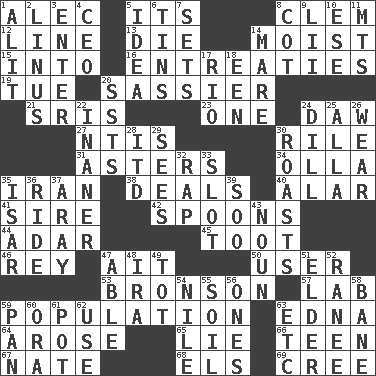 ACROSS 1. Actor Baldwin 5. ___ a Wonderful Life 8. To starve (Brit.) 12. Actor's bit 13. Expire 14. Damp 15. To the inside or interior of 16. Pleas 19. Third day of the wk. 20. More disrespectful 21. Indian titles of respect 23. Single 24. Fool 27. Nuclear Threat Initiatives 30. Cause heat under the collar 31. Michaelmas daisies 34. Rounded earthenware pot or jar 35. SW Asia republic 38. Allots cards 40. Having or resembling wings 41. Beget 42. Soup utensils 44. The sixth month of the Jewish calendar 45. A blast of a horn 46. Marina Del _, California 47. Small island 50. One who uses or employs something 53. "Death Wish" actor 57. Experiment locale 59. Census information 63. Pulitzer Prize-winning author Ferber 64. Came up 65. Falsehood 66. Adolescent 67. Nathan's nickname 68. Raised railways 69. Algonquian DOWN 1. Set down 2. "_ and Lucy" (Charlie Brown theme song) 3. Keyboard key 4. Corporate head (abbr.) 5. The main thing one is thinking about 6. Airtight sealed metal containers 7. Puts into a specified state 8. Small bed 9. Cards in a Roman deck? 10. Compass dir. 11. Mountains (abbr.) 14. Female horse 17. River (Sp.) 18. Car or cant ending 20. Fast planes 22. More lacking in sense or substance 24. Deli pickle 25. Silent film actress Nazimova 26. Put on (as clothing) 28. It would 29. Observes 30. Ridicules or criticizes harshly 32. Hit sharply and swiftly 33. Narrow opening 35. Austrian river, tributary to the Danube 36. Travel on an animal 37. Like ___ of sunshine 39. "Barney Miller" actor Jack 43. Part of speech 47. Competent 48. Lyricist Gershwin 49. Small child 51. A person who is older than you are 52. The wife of a rajah (variant) 54. Mediterranean tributary 55. Land 56. Singles 58. Object of repulsion 59. Baking dish 60. Mouth or opening 61. Cooking vessel 62. Purpose 63. And so on (abbr.)
