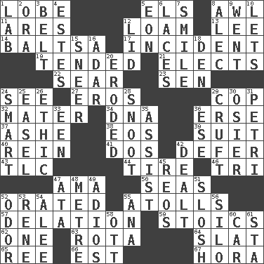 ACROSS 1. Ear part 5. Raised railways 8. Leather borer 11. Ancient Greek god of war 12. Rich soil 13. Area sheltered from the wind 14. Greek mezzo-soprano Agnes 17. Happening 19. Watched over 21. Chooses 22. Singe 23. Elected rep. 24. Observe 27. Greek god of love 29. Police officer (slang) 32. Mother 34. Heredity factor (abbr.) 36. Celtic language 37. American tennis player Robert 38. Greek goddess of the dawn 39. Set of matching outer garments 40. It's straight from the horse's mouth 41. Two (Sp.) 42. Postpone 43. Affectionate concern, for short 44. Hoop that covers a wheel 46. Three (prefix) 47. Nursemaid (var.) 50. Oceans 52. Spoke pompously 55. Ringlike coral islands and reefs 57. Conveyance 59. Unemotional ones 62. Single 63. Round or rotation of duties 64. Narrow board 65. To separate or throw off 66. Eastern Standard Time (abbr.) 67. Israeli folk dance DOWN 1. Experiment locale 2. Mouth or opening 3. Waist strap 4. _____ Park, CO 5. A really long time 6. Shoestrings 7. Grin 8. Actor Baldwin 9. Left 10. Allows 12. Hat (slang) 15. Contemptuous expression 16. The sixth month of the Jewish calendar 18. Lair 20. Eaten away 24. Don Adams' spy role 25. Artist's stand 26. Value system 28. Snob 29. An unpleasant substance 30. Flexible twig of a willow tree 31. _ dish (used to culture cells) 33. Car or cant ending 35. Aid 36. Compass dir. 42. Started a card game 45. Vintage cars 47. "One Day ___ Time" 48. Distance measurement (Brit.) 49. Goodbye (Sp.) 51. Agitate, as a liquid 52. Scent 53. French philosopher Descartes 54. Toward shelter 55. Santa ___, CA 56. Grain storage tower 58. Baseball player Mel 60. Automobile 61. R.R. building