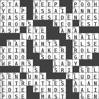 ACROSS 1. R.R. building 4. Shed a tear 8. "Silly old bear" 12. Sharp bark 14. Slender Brazilian palm 16. Singer Murray 17. Raze (variant) 18. Homes 20. Metal shackles 22. Modern: prefix 23. Eastern Standard Time (abbr.) 24. Cleo's killer 25. First lady 28. Santa ___, CA 30. Put down 31. Slow-paced one 35. Actress Charlotte 37. Pismires 40. Otherwise 41. Distinctive style or manner 42. Member of a famous L.A. basketball team 44. Hero or heavy, e.g. 45. Southwest Nigerian state 46. Flatfish 47. Turn to the right 48. Erodes 50. Kenny Rogers chart-topper in '80 52. Raised railways 54. _ Lanka 55. Set 58. Elected rep. 61. Single; one (prefix) 63. Evade 65. Pleas 70. Actor Alda or Thicke 71. Singer Brickell 72. Hangs 73. Indonesian resort city 74. Introduce or present, as a question 75. Vertical spar for supporting sails 76. Commissioned mil. rank DOWN 1. Damascus' land 2. Lacerates 3. Columnist Joseph or Stewart 4. Armed conflict 5. Compass dir. 6. Double-curved letter 7. Ache 8. Baking dish 9. At one time in the past 10. Singles 11. Behest 13. Animal enclosure 15. The content of cognition 19. Immeasurably long periods of time 21. Ocean 26. Small bottle 27. Ferber et al. 29. Disorder of the immune system 30. Poe poem 32. Medicinal plant 33. Small island 34. Area sheltered from the wind 35. French philosopher Descartes 36. Opera by Verdi 38. Ring climax 39. Makes a sale 41. Promise 43. Buttocks 49. Change direction abruptly 51. Expire 53. Fastener 55. Russian prison camp 56. Peak District village in England 57. Soviet premier 1918-24 58. Ooze 59. Inside; within (prefix) 60. Nuclear Threat Initiatives 62. Detail 64. Experiment locale 66. To separate or throw off 67. _ tizzy (2 wds.) 68. Begley and Asner 69. Fast jet (abbr.)