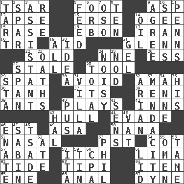ACROSS 1. Russian ruler of old 5. Pick up the tab 9. Viper 12. Domed church section 13. Celtic language 14. Double curve, resembling the letter S 15. Raze (variant) 16. Inky black, to poets 17. SW Asia republic 18. Three (prefix) 19. Assist 21. American astronaut and politician John 22. Disposed of to a purchaser 24. Compass dir. 26. Double-curved letter 27. Having lost freshness 28. Implement 29. Petty quarrel 30. Prevent the occurrence of 32. Wet nurse 36. Hyperbolic tangent 37. ___ a Wonderful Life 38. Painter Guido (1575-1642) 39. Pismires 40. Romps 42. Lodging establishments 43. Frame or body of a ship 44. Elude 46. Eastern Standard Time (abbr.) 49. White ___ sheet 50. Nanny 51. Relating to the nose 53. Pacific Standard Time (abbr.) 54. Small bed 57. Blind as ____ 58. Hankering 61. Pale green bean 62. Event that recurs at intervals 63. Native american tent (variation) 64. Detail 65. Compass dir. 66. Of or related to the anus 67. Centimeter-gram-second unit of force DOWN 1. Small pie 2. Coast Guard woman 3. Aide 4. To sift 5. Nourish 6. Globe 7. Bear (Spanish) 8. "___ Little Indians" 9. Match 10. Actors Connery and Penn 11. Actor Sean's family 14. Petroleum 19. Everything 20. It may be bright or harebrained 21. Set 23. Expletives 24. Annoyingly loud 25. Lower and raise head in agreement 27. Connect, as a bridge 28. "_____ Recall" 29. R.R. building 31. Country residence 32. Believer in; advocate of (suffix) 33. Ananias' fault 34. Singer Murray 35. Part of HMS, perhaps 40. Product of festering 41. Elected reps. 43. Actor Linden 45. Large container 46. Related on the mother's side 47. Unit of acoustic absorption 48. Sadhe (variant) 52. Had dinner 53. Silvers or Donahue 55. Sign of something about to happen 56. Docile 58. Call ___ day 59. Metal container 60. Numbers guy (abbr.) 61. Hat (slang)