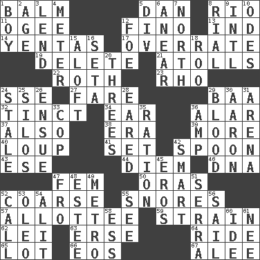 ACROSS 1. Lip ointment 5. Daniel's nick name 8. River (Sp.) 11. Double curve, resembling the letter S 12. Fine (Spanish) 13. Indiana (abbr.) 14. Gossips 17. Make much ado about nothing 19. Erase 21. Ringlike coral islands and reefs 22. Writer of Portnoy's Complaint (1969) 23. 17th letter of the Greek alphabet 24. Compass dir. 27. Conductor's collection 29. Sound made by sheep 32. Tinged 34. Ewer handle 36. Having or resembling wings 37. In addition 38. Epoch 39. Greater amount 40. Central Nebraska county 41. Put into a specified state 42. Soup utensil 43. Compass dir. 44. South Vietnam president (1954) 46. Heredity factor (abbr.) 47. Opposite of masc. 50. Mouths or openings 52. Rough 55. Sounds asleep 57. One to whom something is allotted 59. Put through a sieve 62. Luau accessory 63. Celtic language 64. Travel on or in a vehicle 65. Car dealer's back yard 66. Greek goddess of the dawn 67. Toward shelter DOWN 1. Male child 2. Ripen 3. Grant temporary use of 4. Distance measurement 5. HTML Container Element 6. Approach 7. 0 degrees 8. Monetary unit of Yemen 9. International (abbr.) 10. Lyric poems 12. Enemy 15. Upward 16. Bristle 18. Friend of Pooh 20. Threesomes 24. Showing deterioration from age 25. Grain storage towers 26. Follow as a consequence or result 28. Having ears or earlike features 29. Vital fluid 30. Composer Copland 31. Sports stadium 33. Police officer (slang) 35. Food allowance for one day 36. Electrical Unit 42. Don Adams' spy role 45. Greek god of love 47. Back 48. First name in cosmetics 49. Paris' subway 51. Spanish missionary in California 52. Give a ring to 53. Margarine 54. Came down and settled, as after flight 55. Perceive with the eye 56. Travel by water 58. Curvy letter 60. Binary compound 61. Born