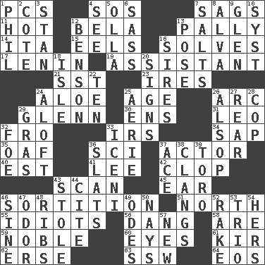 ACROSS 1. Personal Computers (abbr.) 4. Distress signal 7. Sinks 11. Being at a high temperature 12. Actor Lugosi 13. Friendly 14. Call ___ day 15. Snakelike fish 16. Finds the solution 17. Soviet premier 1918-24 19. Aide 21. Fast jet (abbr.) 23. Angers 24. _ vera 25. Personal question 26. Curve 29. American astronaut and politician John 30. Followers of ems 31. Lion 32. Back 33. Big collection agency 34. Plant excrement 35. Clumsy lout 36. _-fi 37. Thespian 40. Eastern Standard Time (abbr.) 41. Area sheltered from the wind 42. Hoof sound 43. Examine minutely or intensely 45. Ewer handle 46. Conclusion 51. _ pole 55. Foolish or stupid persons 56. Mild oath, euphamism for damn 58. "We ___ not amused" (Victoria) 59. Impressive in appearance 60. Sight organs 61. Apertif with cassis 62. Celtic language 63. Compass dir. 64. Greek goddess of the dawn DOWN 1. Silvers or Donahue 2. ____ d'Azur (French Riviera) 3. Comedian Laurel of Laurel & Hardy 4. Observe 5. Spanish pot 6. Backtalk 7. Table seasonings 8. Inventor's middle name 9. Small, secluded valley 10. System (abbr.) 12. Gillaume's butler role 13. Airs 16. Begets 18. Capri or Wight 20. Public displays of written messages 22. Nine, plus one 24. High up in or into the air 25. Nest on high 26. Columnist Joseph or Stewart 27. Located in or toward the back 28. Police officer (slang) 29. Pate de foie ____ 32. Enemy 33. Ancient Celtic tribe of eastern Britain 36. Narrow boards 37. Adept person 38. Rings like a ship's bell 39. "Corrida" creature 43. Fur scarf 44. Quote 46. Trig term 47. Aroma 48. Teases 49. Lyric poems 50. Negative votes 52. Immoral or dissolute person 53. Musical group of three 54. Possessive pronoun 57. ___ Haven, CT