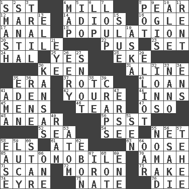 ACROSS 1. Fast jet (abbr.) 4. Place where flour is made 8. Lightbulb-shaped fruit 12. Female horse 14. Goodbye (Sp.) 16. Stare at amorously 17. Of or related to the anus 18. Census information 20. Vertical member of a panel or frame 22. Product of festering 23. Put into a specified state 24. Actor Linden 25. It is so 28. Supplement with great effort 30. Peachy ____! 31. Place in a line 35. Period 37. College mil. group 40. Grant temporary use of 41. An important port of Yemen 42. You are 44. Lodging establishments 45. Not women's 46. Lacerate 47. Bear (Spanish) 48. Approach 50. Inconspicuous attention getter 52. Ocean 54. Perceive with the eye 55. Remaining after all deductions 58. Raised railways 61. Had dinner 63. Trap for birds or small mammals 65. Form of transportation 70. Wet nurse 71. Glance over 72. Person of subnormal intelligence 73. Libertine 74. Jane of fiction 75. Nathan's nickname 76. Pass on DOWN 1. Box-office sellout 2. Before Barbara or Clara 3. Lag or linger behind 4. Atlas unit 5. Wedding promise 6. Mouth edge 7. Central Nebraska county 8. Plant holder 9. Armor plate that protects the chest 10. _ vera 11. Monthly bill 13. Pipe bend 15. Turn sharply 19. "____ silly question..." 21. Sight organ 26. Suggestive of the supernatural 27. Snout, nose 29. American author Paul (1891-1958) 30. Sunflower state 32. Charged atoms 33. Billionth: prefix 34. Followers of ems 35. Paradise 36. French philosopher Descartes 38. Third day of the wk. 39. Dice game 41. Nanny (var.) 43. Celtic language 49. 480, 500 or 516 sheets of paper 51. Elected rep. 53. Tiny particle 55. Wanderer 56. 1973 Nobel Price Winner (Physics) Leo 57. Giggle 58. Relaxation 59. "I Love _" 60. Play the lead 62. Inky black, to poets 64. Boat paddle 66. Single 67. Retirement account (abbr.) 68. Car dealer's back yard 69. Compass dir.