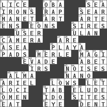 ACROSS 1. Louse (plural) 5. Chief or king in Benin or Nigeria 8. Ocean 11. Removes the wrinkles 13. Strike 14. Burn superficially 15. French painter Edouard 16. Nonscientific branch of learning 17. Johnson of "Laugh-In" 18. Followers of ems 19. Immeasurably long periods of time 21. Fathers 22. One who makes use of a thing 24. ____ Bator 25. Device for capturing images 27. "We ___ not amused" (Victoria) 29. At sea 30. Beach, in Buenos Aires 32. Writing tablets 33. Haggard of country music 35. Wise men 39. Dodge 41. Collude with 42. Big collection agency 43. Annoying sounds 45. _ mater 48. Billionth: prefix 49. Satellite of Uranus 50. Coldest temperatures 52. Allow 55. Locales 56. Bar bill 57. Dodge 59. Sign of something about to happen 60. Wedding promise 61. Locates 62. Erode 63. Sight organ 64. Undesirable depression on a surface DOWN 1. Citrus frut 2. SW Asia republic 3. Eaten 4. Compass dir. 5. Northwest Algerian city 6. Taverns 7. Fitting 8. Spanish missionary in California 9. Ingested 10. Ancient Greek god of war 12. Guide 14. Travel by water 20. Mouth or opening 21. Chop _ 23. Gospel singer Marvin 25. Head covering 26. White ___ sheet 27. Everything 28. Actress Charlotte 30. Before (prefix) 31. With great haste 33. Impair 34. Begley and Asner 36. Utter; complete 37. Unit of force equal to gravity 38. ___ a Wonderful Life 40. Small bottle 43. Compass dir. 44. Fertile tracts in a desert 45. Odor 46. It is permitted: Lat. 47. Chow _ 49. _ vera 50. Kenny Rogers chart-topper in '80 51. Mitch Miller's instrument 53. Genesis locale 54. Trial 56. Neckwear 58. Flaplike covering